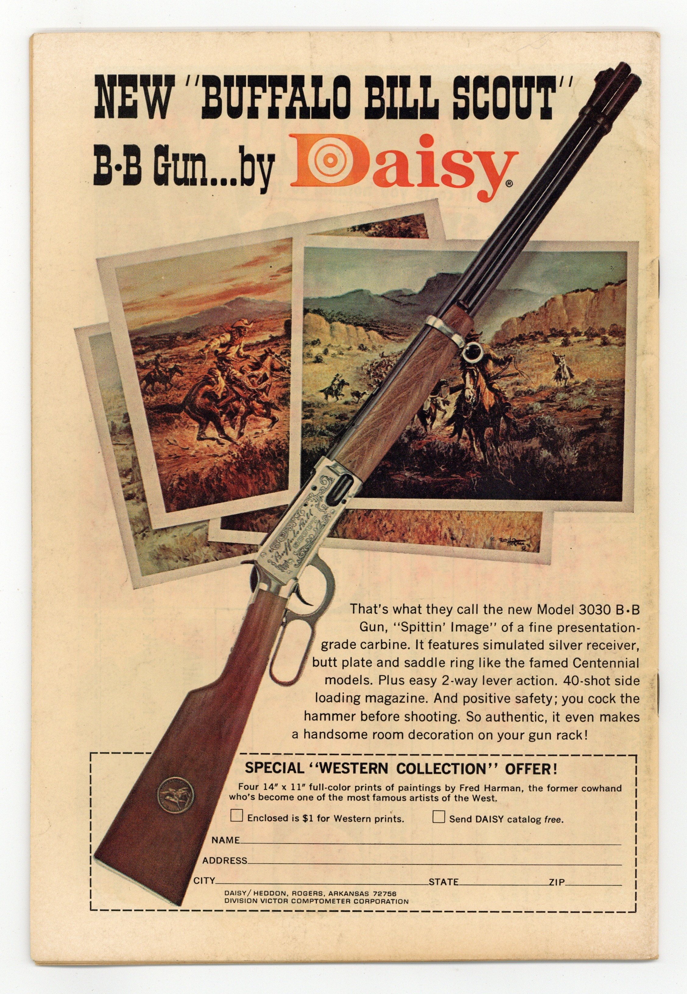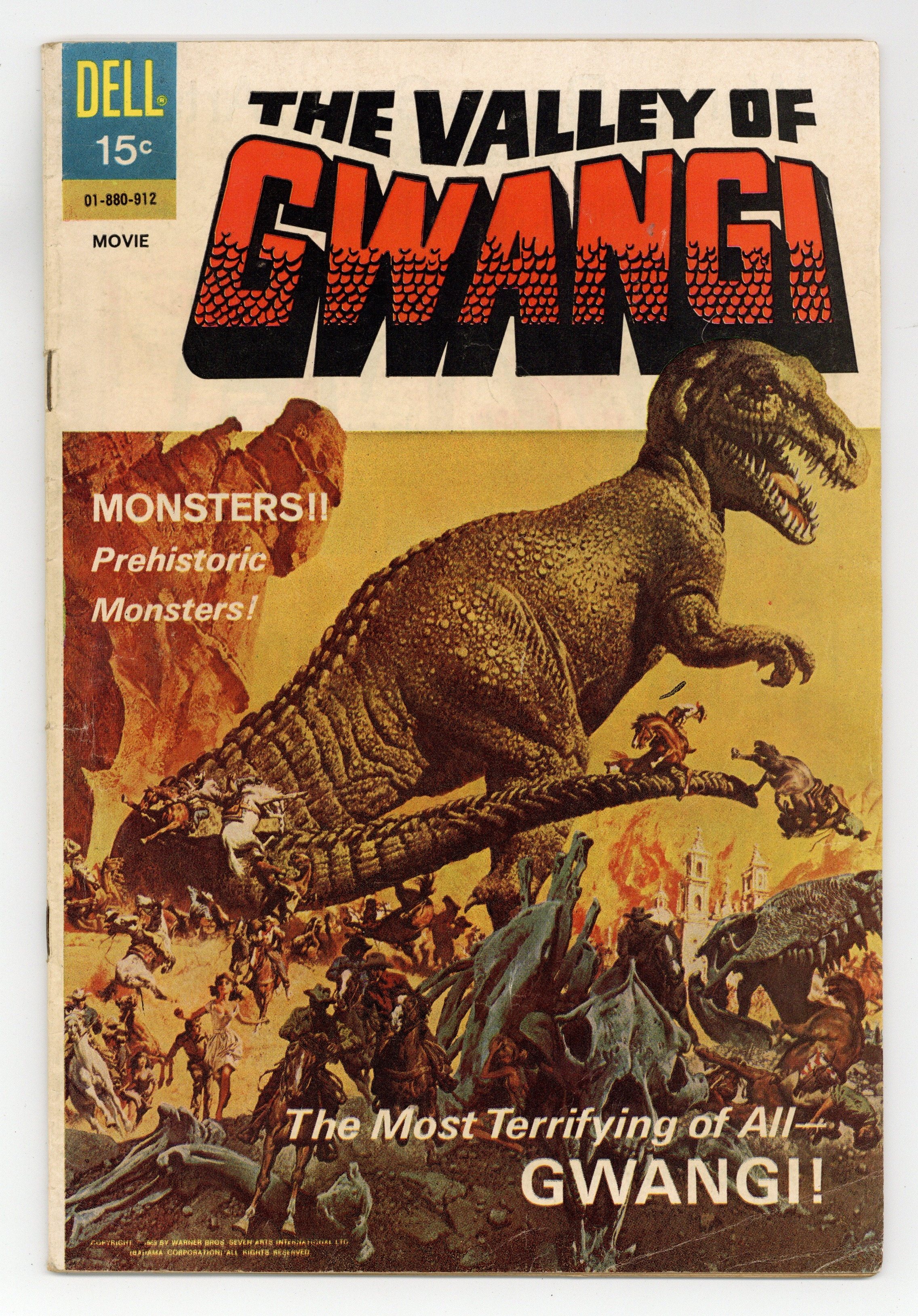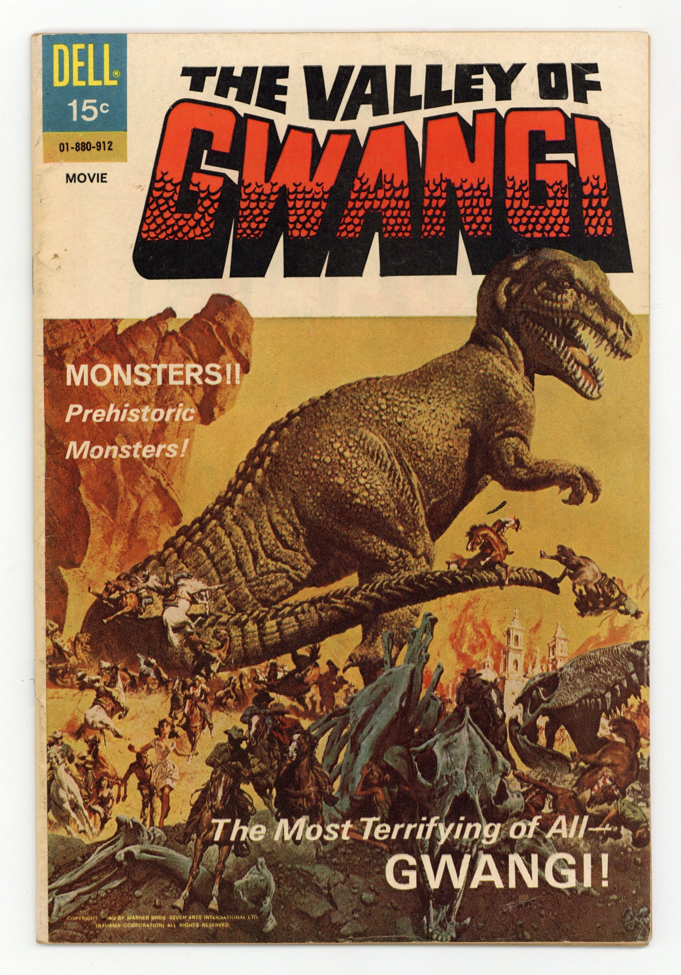 $33.50Cover by Frank McCarthy. Art by Jack Sparling. Cover number is #01-880-912. Dell Movie Classics presented comics based on Hollywood films (not all of them classics). This issue is based on the 1969 sci-fi Western produced by Charles H. Schneer and Ray Harryhausen. It's cowboys vs. dinosaurs, a combination that will make any little kid's heart jump for joy. When cowboys explore the Forbidden Valley in Mexico at the turn of the 20th century, rodeo cowgirl TJ and stuntman Tuck are startled to find prehistoric creatures. Efforts to capture creatures for the circus unleash Gwangi, an allosaurus who then runs amok in the streets of the town. The original film had effects by the great Ray Harryhausen, and was conceived by Harryhausen's mentor, Willis O'Brien of King Kong fame. Cover from the movie poster by Frank McCarthy. 32 pages, Full Color. Cover price $0.15.