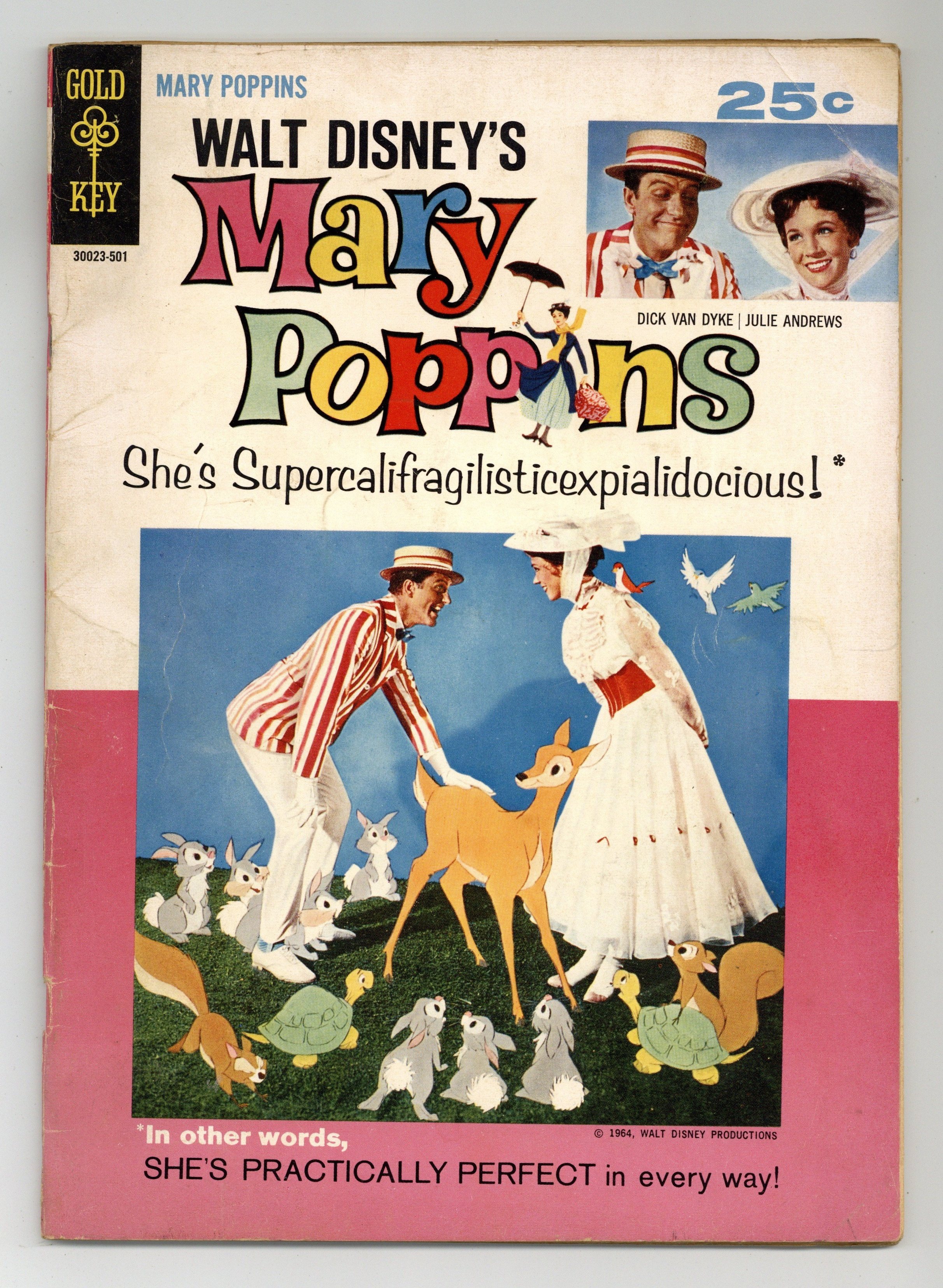 #30023-501 on cover. Photo cover of Julie Andrews (as Mary Poppins) and Dick Van Dyke (as Bert). Introductory page with six movie stills and text on inside front cover. "Mary Poppins," script by P.L. Travers (novel) and Bill Walsh (screenplay), art by Dan Spiegle; A nanny with magical powers comes to work for a banker's miserable family. Based on the 1964 Disney film. Movie still on inside back cover. Movie still on back cover. 68 pgs., full color. $0.25. #6501 Cover price $0.25.