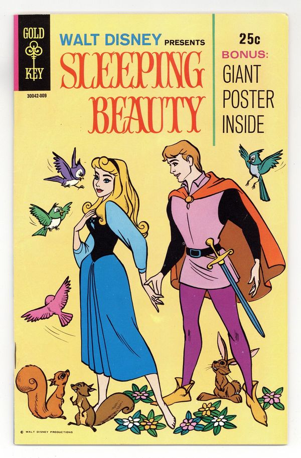 This edition DOES include a pull-out poster. Number 30042-009. September 1970. Reprint of the comic book adaptation of the 1950s Disney animated movie "Sleeping Beauty," that appeared in Four Color 973. This edition features pinups of Princess Aurora and Prince Phillip on the inside and back covers and a pullout poster. Entire book is comic, no ads. Story and art credits: unknown. 25-cent cover price. Cover price $0.25.