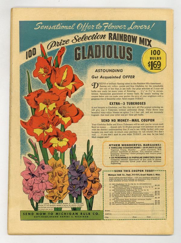 $35.00Art by Al Ulmer and Paul Parker. Another crime comic from the prolific studio of Joe Simon and Jack Kirby, this one featuring crimes throughout history as well as the standard gangster tales. Sometimes listed as Real Clue Crime #50. No issue # on cover; Vol. 5, issue #2 in indicia. Dapper hold-up man Lucky Murdock believes he can never be caught as long as he has his lucky doubloon. A poor cobbler in Imperial Germany impersonates an officer with a counterfeit uniform. A hapless cabbie is mistaken for a scientist and abducted to another planet by aliens, in an offbeat comedy story. Pirate in a Tuxedo; The Cobbler; Rachel's Racket; Off Montauk; Free-Wheeling Oscar; The Little Corporal Must Go; The End of Black Mike. 48 pages, Full Color. Cover price $0.10.