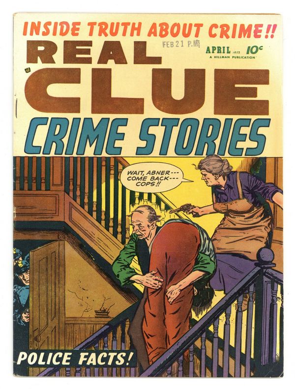 Cover by John Prentice. Art by Bill Ely and Gerald McCann. Another crime comic from the prolific studio of Joe Simon and Jack Kirby, this one featuring crimes throughout history as well as the standard gangster tales. Sometimes listed as Real Clue Crime #74. No issue # on cover; Vol. 7, issue #2 in indicia. A rookie cop learns respect for a disabled veteran of the force. A gangster is tracked down by the ex-partner he double-crossed years before. A French thief becomes determined to win back the woman he once loved. The Vice President's Finger; Magic Eyes Of the Law; The Sitting Cop; The Gun That Lied; The Innocent Reaper; Little Gold Rogue's Gallery. 32 pages, Full Color. Cover price $0.10.