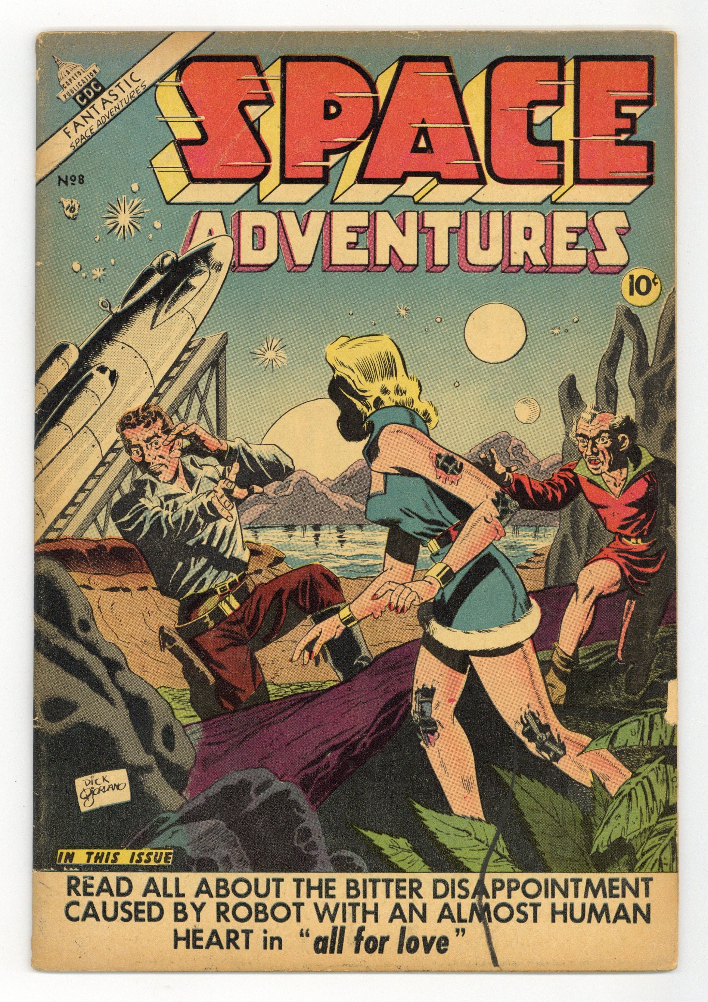 Cover art by Dick Giordano. "All for Love," script by Carl Memling, pencils by Dick Giordano, inks by Art Cappello; Jason Casan is rescued from his wrecked spaceship when it crash lands on an asteroid named Vulca; His rescuers are the aged Doctor Artuk and the young and beautiful blonde woman named Clio. "Pet Hate," art by Stan Campbell; A group of settlers land on the planet Pharisee; They encounter a large predator dubbed a piranosaur attacking a small, cute creature; The expedition leader calls it a winky due to its rapid eye blinking; The colonists attach to their winkies as pets. "World without Children" text story by Dick Giordano. "The Cycle of Death," pencils by Frank Frollo, inks by John Belfi; Peter Fresno and Hugh Mason explore a desolate city on Mars; They discover a museum and a statue; The statue informs them by telepathy that the Martians were wiped out by a deadly red dust. "First Contact" one-page story, art by Tony Tallarico; Foodie Somak and his friends are taken aboard a spacecraft by aliens called the Denebians; The extra-terrestrials can't survive in the atmosphere; Instead they take the trio along with them to their planet, saying they intend no harm. "Flower from Pharaoh," pencils by Frank Frollo; World War V has ended. The people of Earth-2 in a solar system where they fled to escape the dying sun now face overpopulation; A space station is built; Dr. Flyk returns with a flower from the planet Pharaoh. 36 pgs., full color. Cover price $0.10.