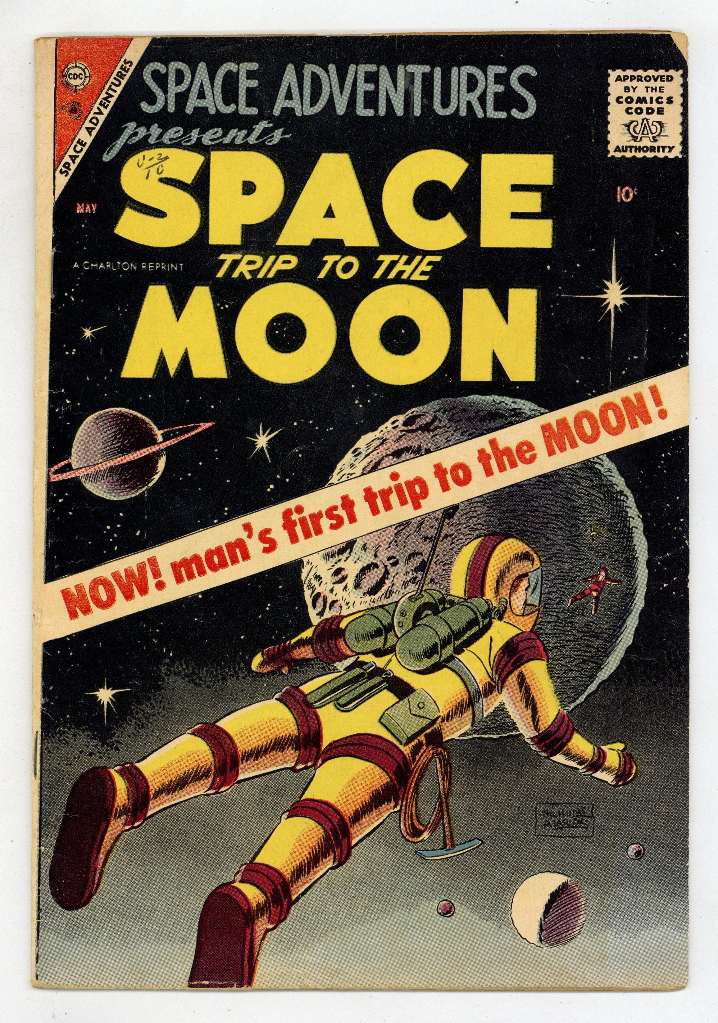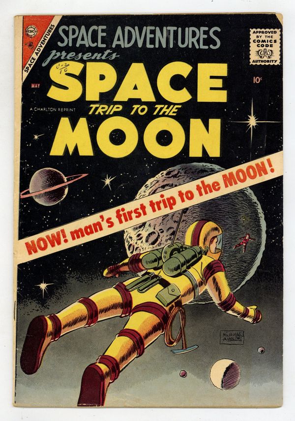 Reprints Fawcett's Destination Moon. First Trip to the Moon - Written by Otto Binder (adapted from the film by Rip Van Ronkel, Robert Heinlein and James O'Hanlon). Art by Dick Rockwell and Sam Burlockoff. Cover by Charles Nicholas and Vince Alascia. Scientist Charles Cargreaves and General Thayer are bound and determined to put an American rocket on the Moon. And they have to leave now...before the government can stop them! Plus: 3-page reprint text article "Moon Victory"! 36 pages, full color. Cover price $0.10.