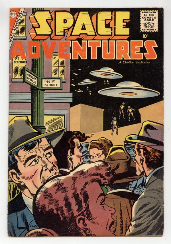 Cover by Rocco "Rocke" Mastroserio. Stories and art by Steve Ditko and Rocco "Rocke" Mastroserio. Sci-fi and super-heroics from Charlton Comics. Aliens find they are invisible on Earth and try to observe its people, in one of three stories in this issue featuring early art by Spider-Man co-creator Steve Ditko. In another Ditko story with some cool spaceships but dubious ethnography, a Chinese teacher reveals that the Chinese people are actually survivors of an advanced alien race. The third Ditko story involves an attack by the Moon people on ancient Atlantis. A Visit to Planet 3; The Men From Hsin-Chiu; Destination Earth; Footprints of Fear; Menace From the Moon; Return From Saturn. 32 pages, Full Color. Cover price $0.10.