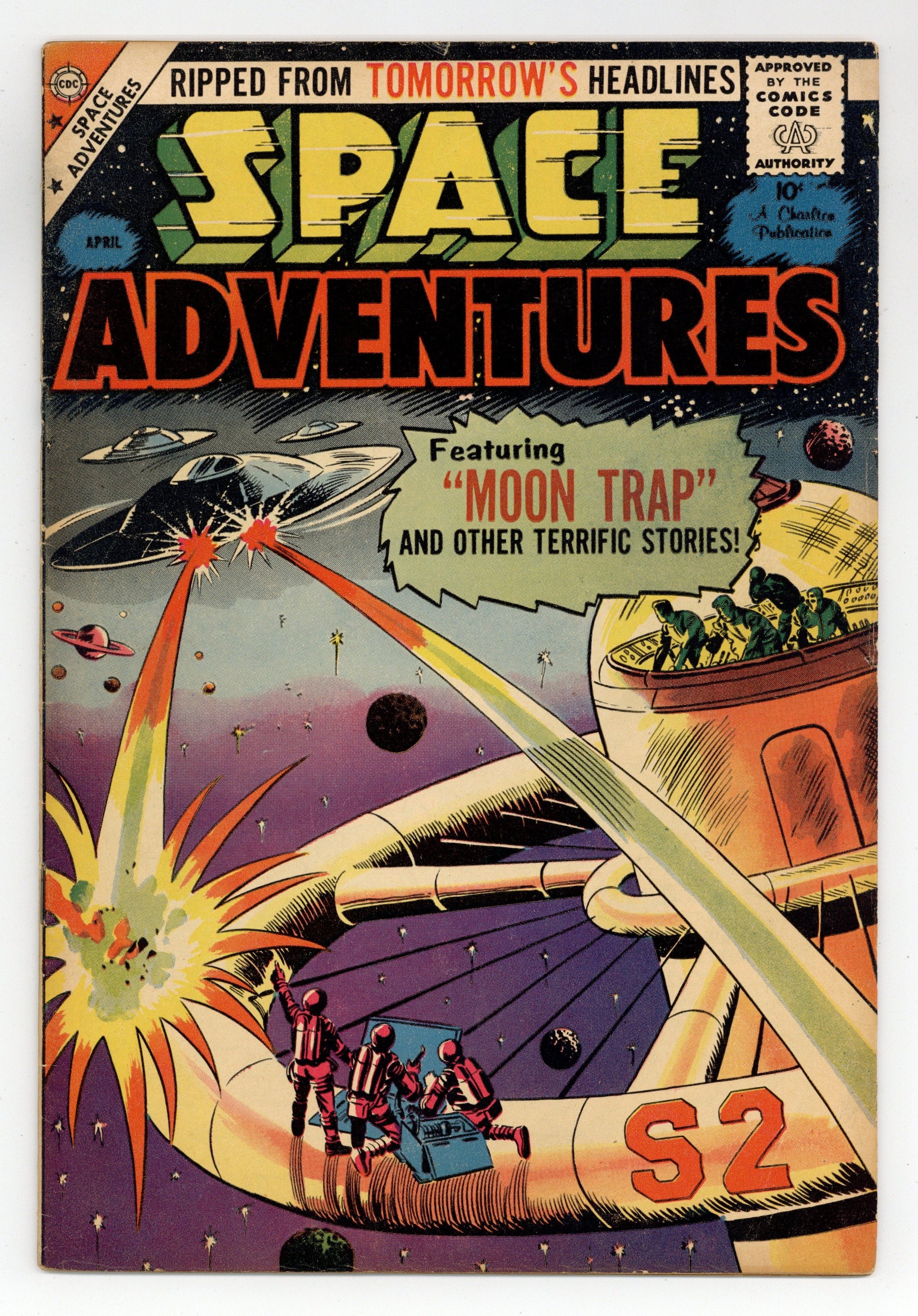 Cover by Bill Molno and Vince Alascia. Stories and art by Matt Baker, Vince Colletta, Charles Nicholas, Sal Trapani, Bill Molno and Ernie Hart. Sci-fi and super-heroics from Charlton Comics. A macho astronaut and his wimpy brother crash-land on the Moon and are captured by a space pirate, in a story featuring early art by comics legend Matt Baker. Aliens return to Earth after thousands of years to reclaim their ancient idol, New Hampshire's Old Man of the Mountain. A scientist discovers that alien "Galactites" have invaded the Earth, disguised as ordinary humans. Plus a vintage ad for a replica hand grenade. Moon Trap; Visitor from the Void; Space Shift; An Idol of Their Own; The Invaders. 32 pages, Full Color. Cover price $0.10.