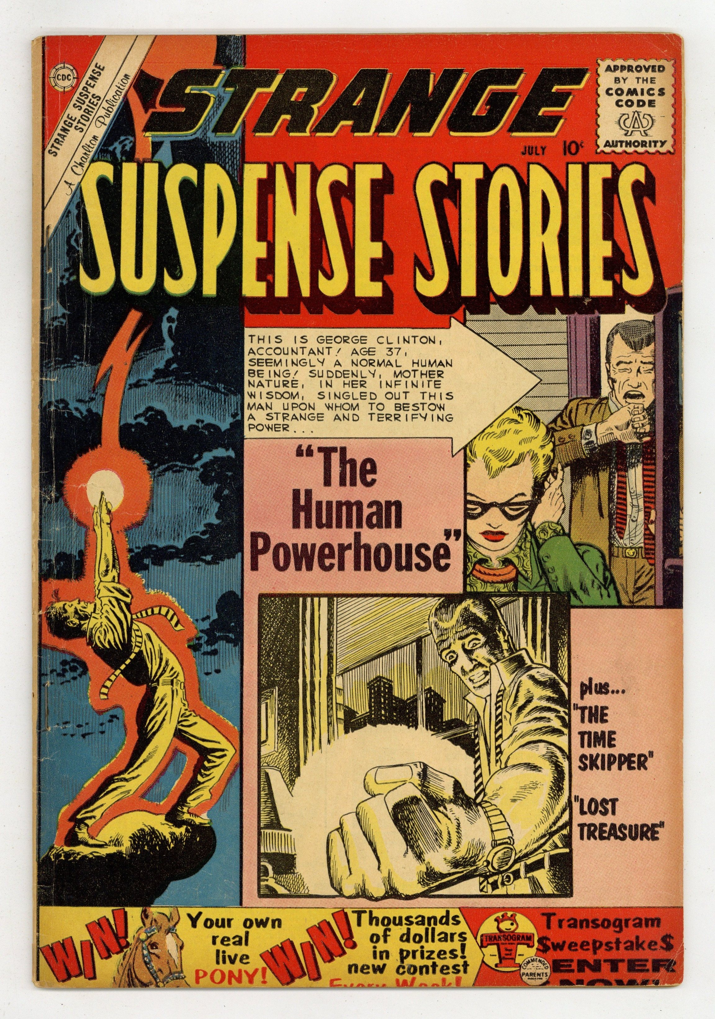 Cover by Steve Ditko. Stories and art by Steve Ditko, Rocco "Rocke" Mastroserio, Bill Molno and Vince Alascia. Short tales of science fiction, fantasy and horror with twist endings. An accountant gains the ability to control electricity, in a story by Steve Ditko that presages Ditko's later Spider-Man foe, Electro. Matt's dreams direct him to a strange machine previously buried by an alien intelligence. Carl, who resembles J. R. "Bob" Dobbs, finds a empty time machine in a cave and decides to take it for a spin. The Human Powerhouse; The Incredible Cosmic Motor; Top Secret; The Time Skipper; A Lost Treasure. 32 pages, Full Color. Cover price $0.10.