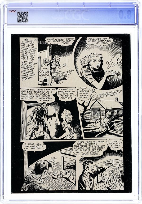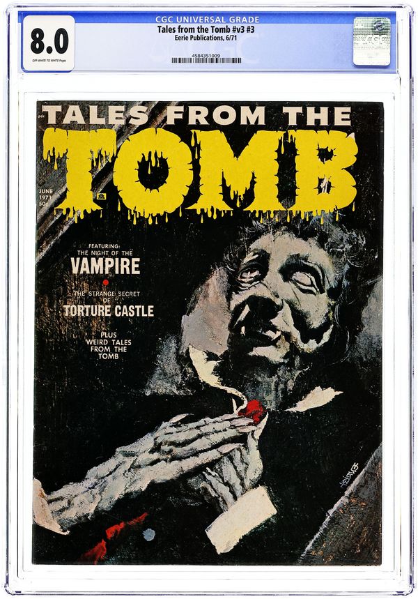 Stories and art by Oscar Fraga, Torre Repiso, Cirilo Munoz, Violet M. Methley and Ezra Jackson. Legendary publisher Eerie presents gory tales of horror and the macabre, many "reanimated" from classic pre-Code horror comics with new art. A vampire bat in a theater's wings is actually a vampire. A man inherits a cursed castle and ignores all the warnings. Explorers seeking the elephant's graveyard are haunted by a ghost. Vampire; Torture Castle; Weird Safari; The Old Hag's Claws of Horror; This Tomb Is Ours; Monster in White; Werewolf Castle; The Ghoul and the Guest. 8 1/2-in. x 11-in. 48 pages, B&W. Mature readers Cover price $0.50.