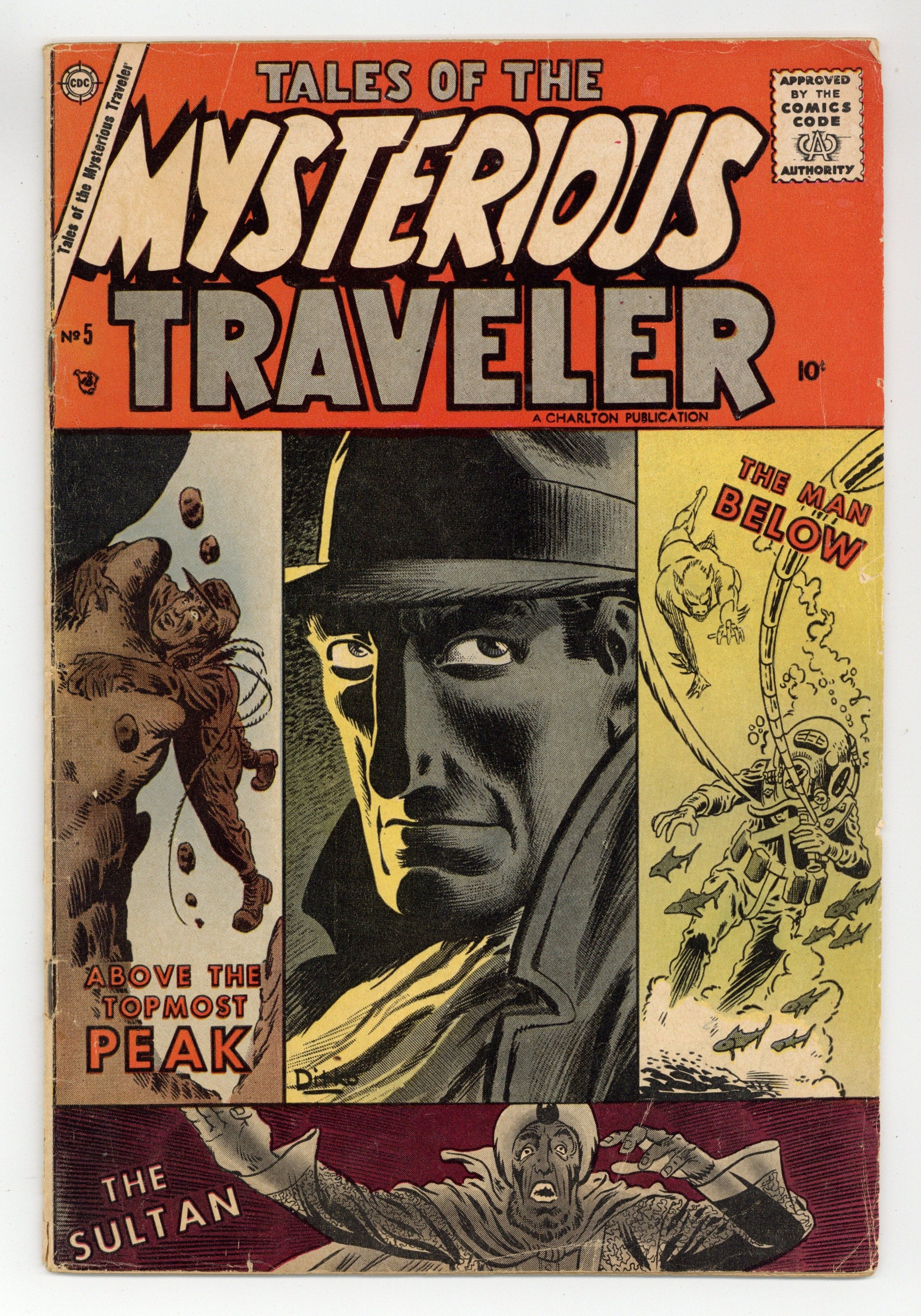 Edited by Pat Masulli. Cover by Steve Ditko. Written by unknown. Art by Steve Ditko, Bill Molno, Charles Nicholas, Rocco Mastroserio and unknown. Chilling, thrilling and frequently fulfilling Tales of the Mysterious Traveler! In this issue: "The Man Below" with art by Steve Ditko; "Greed" with pencils by Bill Molno; "The Beauty Seeker" with art by Charles Nicholas and Rocco Mastroserio; "Above the Topmost Peak" with art by Ditko; "The Sultan" with art by Ditko; and 1-pager "The Jungle's Mysteries"! Plus: 2-page text story "Always an Adventure"! 32 pages, full color. Cover price $0.10.
