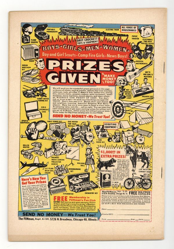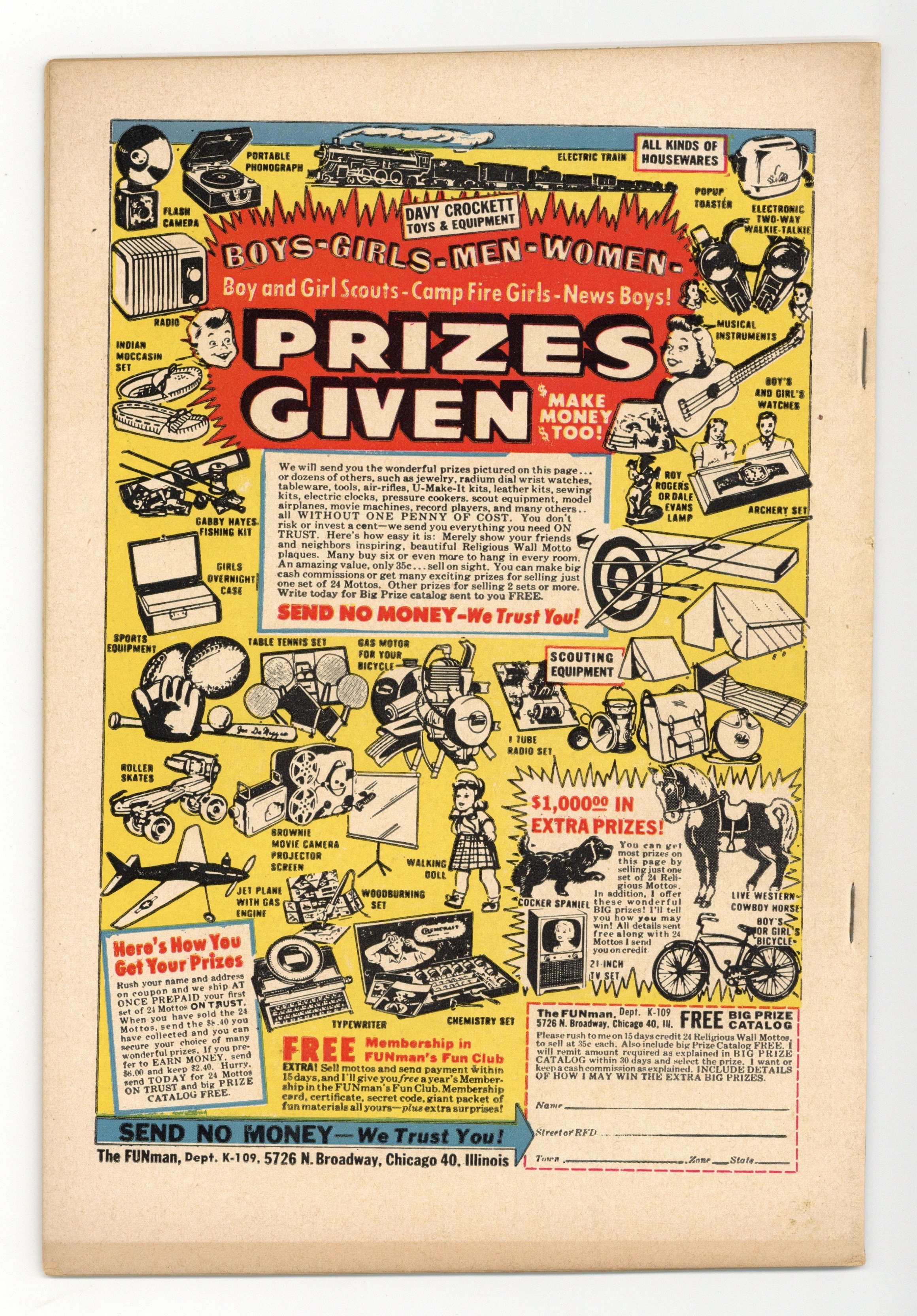 Published 1958 by Charlton Comics Group.$33.00- 8" cumulative spine split. Cover detached. Centerfold detached at one staple. Cover oxidation.