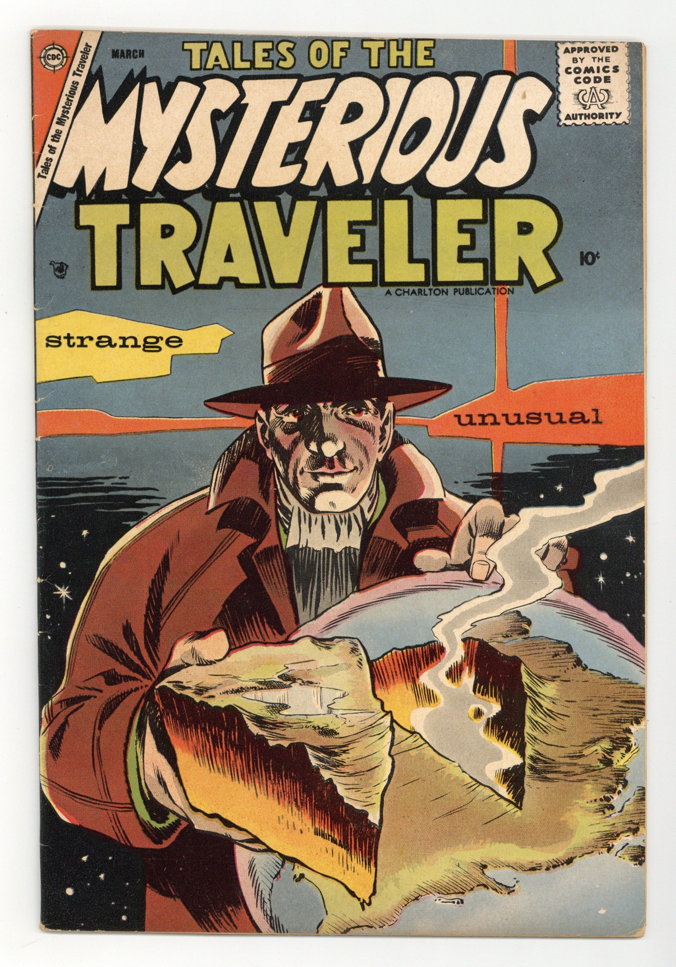 Edited by Pat Masulli. Written by unknown. Art by Steve Ditko, Bill Molno, Rocco Mastroserio and unknown. Chilling, thrilling and frequently fulfilling Tales of the Mysterious Traveler! In this issue: "And the Fear Grew" with art by Steve Ditko; "Not Normal" with art by Ditko; "Night Hunt" with pencils by Bill Molno; "The Heel and the Healer" with art by Ditko; and "The Lonely One!" with art by Rocco Mastroserio. Plus: 2-page text story "Diamonds from Moonport"! 36 pages, full color. Cover price $0.10.
