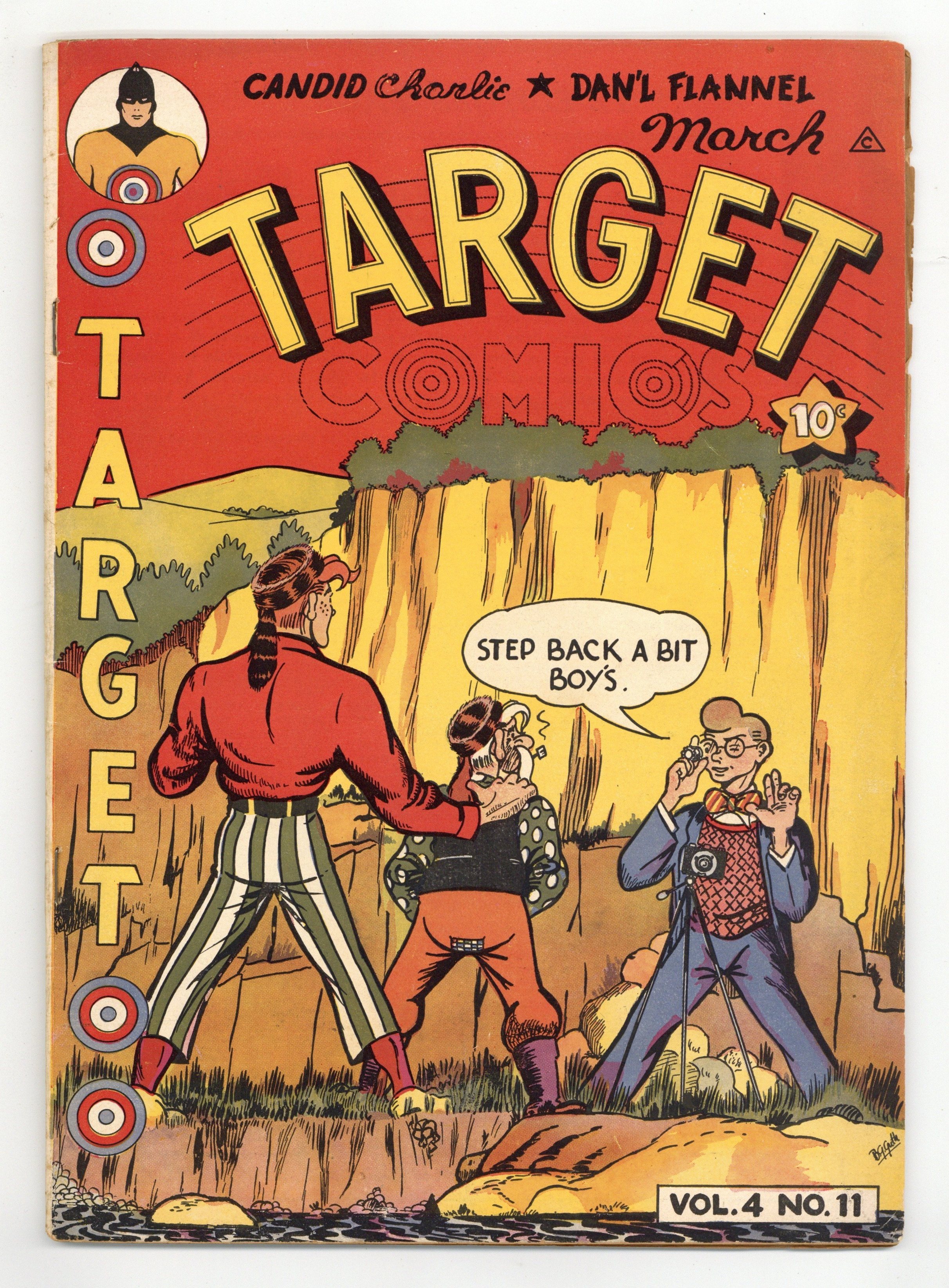 Cover art by B. Gordon Guth. Cadet story. 18 Men and a Boat [part 3], art by Tom Gill. The Circus Comes To Town starring Dan'l Flannel. Bull's-Eye Bill story. Candid Charlie story, art by B. Gordon Guth. Target and the Targeteers story, art by Bill Allison. Speck, Spot, and Sis story, script and art by Alonzo Vincent. Chameleon story, art by Bill Allison. Targettoons story, script and art by Milt Hammer. 56 pgs. $0.10. Cover price $0.10.
