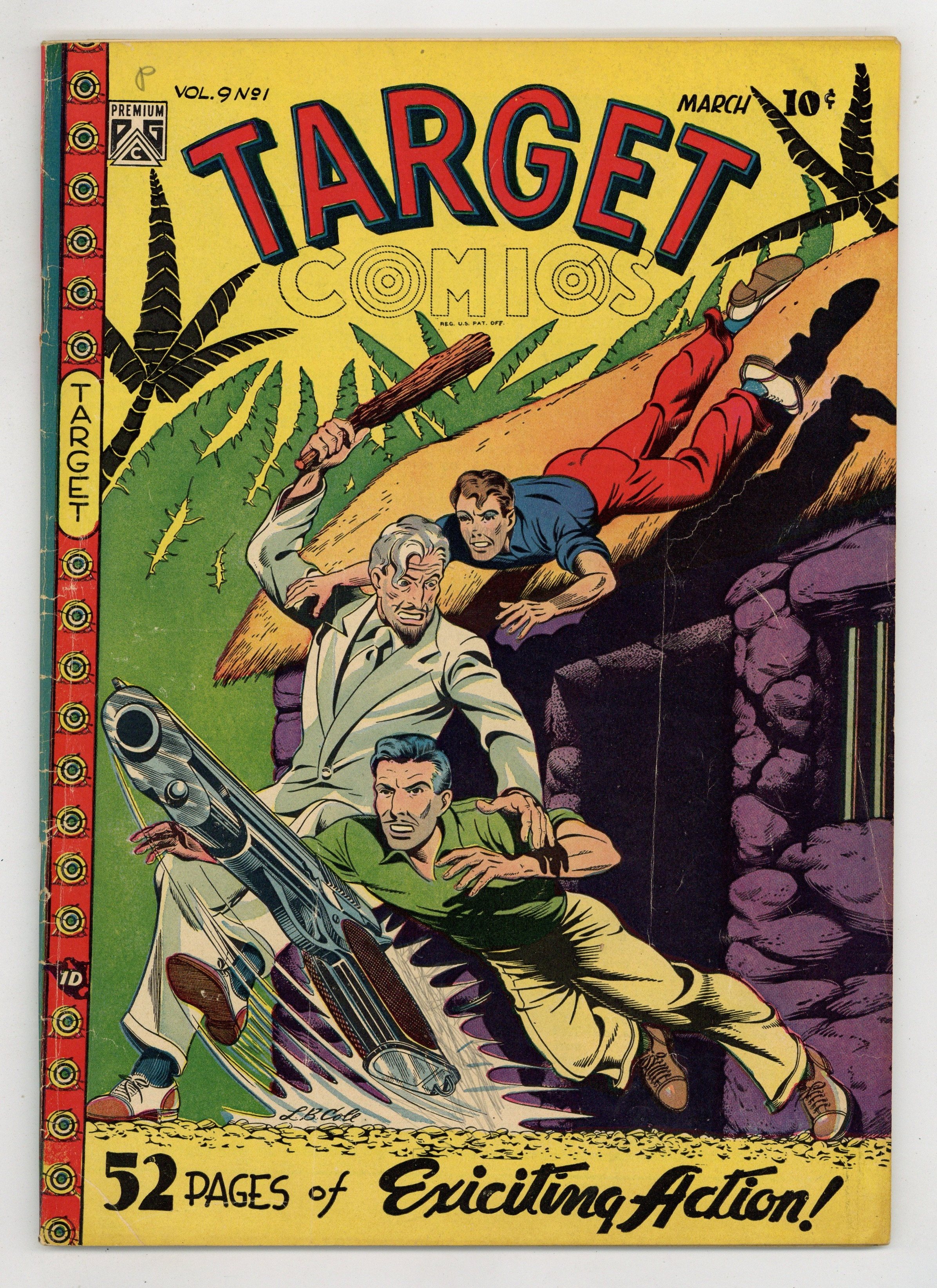 Cover art by L. B. Cole. Cadet story, art by Nina Albright; Kit Carter and Dan Merry go on a scavenger hunt. Target story, art by Ken Battefield. Midnight Fiddler text story. Bull's-Eye Bill western story, art by Joe Certa. The Candy Bar starring Speck, Spot, and Sis, art by Alonzo Vincent; Kids dress as the Shadow and Roy Rogers at a masquerade. Targetoons humor page by Milt Hammer. Candid Charlie story, art by Robert Sale (as Bob Q. Siege). Heathcliff the Hobo story, script and art by Art Helfant. Gary Stark story, art by Don Rico. 52 pgs. $0.10. Cover price $0.10.