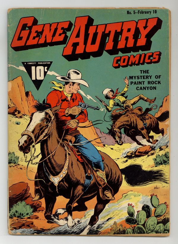 Cover by Till Goodan. Stories and art by Till Goodan and others. Western comics starring beloved singing cowboy Gene Autry. In an issue-length story, Gene gets lost in the desert and winds up in the strange town of Paint Rock Canyon. A no-man's-land for society's rejects, it maintains a status outside the law...as long as no one commits a crime. But the sudden arrival of gold dust changes everything. Gold Flash, the gold-colored wild colt, has been captured by cowboy Bart West, but Flash manages to break free. The Mystery of Paint Rock Canyon; Western Justice; Cowgirls' Bronc Riding; Wild Horse Race; Gold Flash. 64 pages, Full Color. Cover price $0.10.