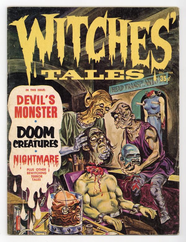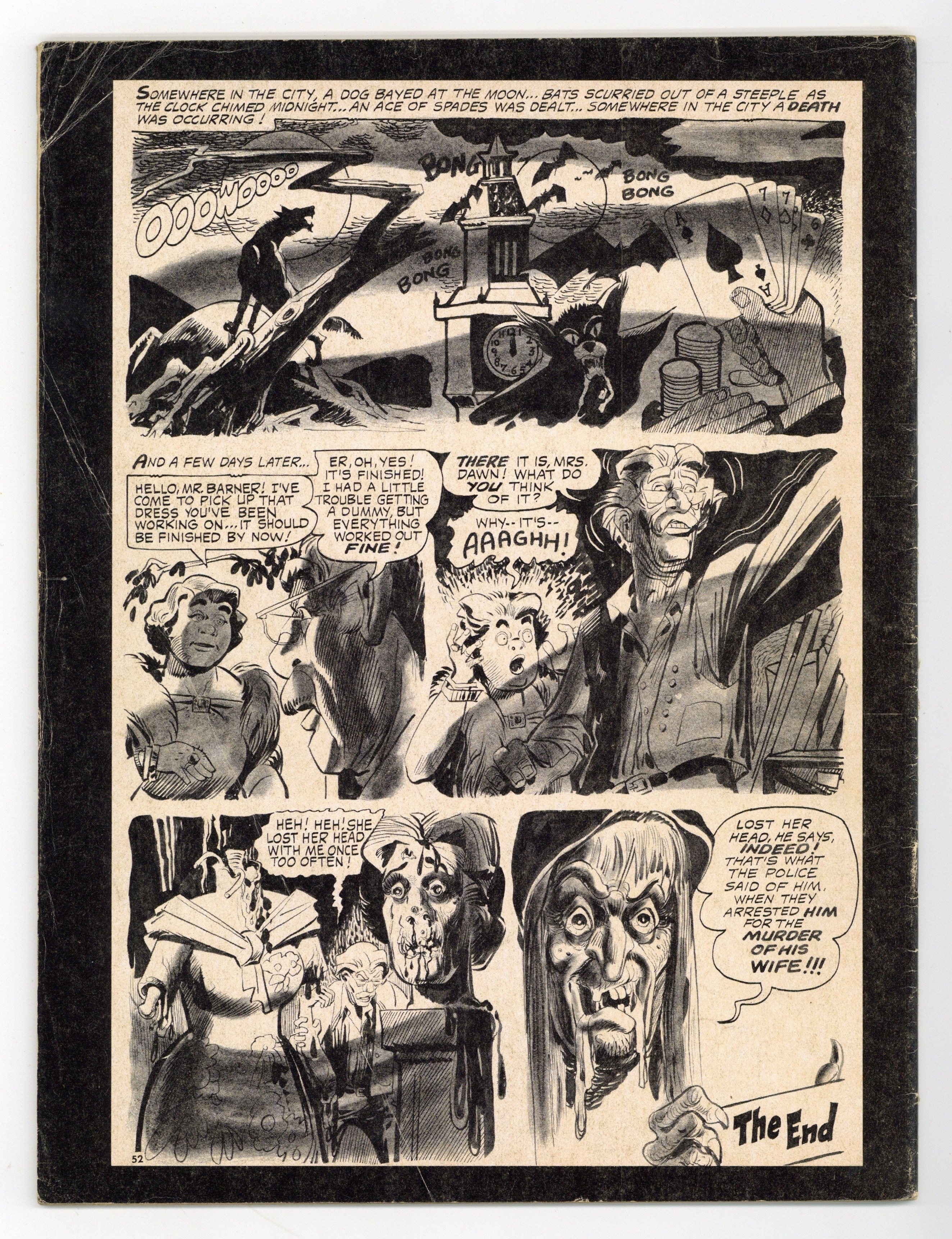 Cover by Bill Alexander. Stories and art by Larry Woromay, Oscar Fraga, Jack Sparling, and Carl Burgos. Tales of horror and the macabre, featuring altered reprints from 1950s pre-Code comics. A glutton and his mother disparage his wife's cooking abilities - until she makes him a meal he'll never forget, in the memorably titled "Yeech!" A desperate man turns to murder and robbery to feed his family. A man builds a robotic woman companion for himself, but the tech support is a killer. The Devil's Monster; Doom Creatures; Yeech!; Nightmare; Blood and Old Bones; Until Death Do Us Part; Thief of Souls; Over Her Dead Body. 8 1/2-in. x 11-in., 52 pages, B&W. Mature readers. Cover price $0.35.