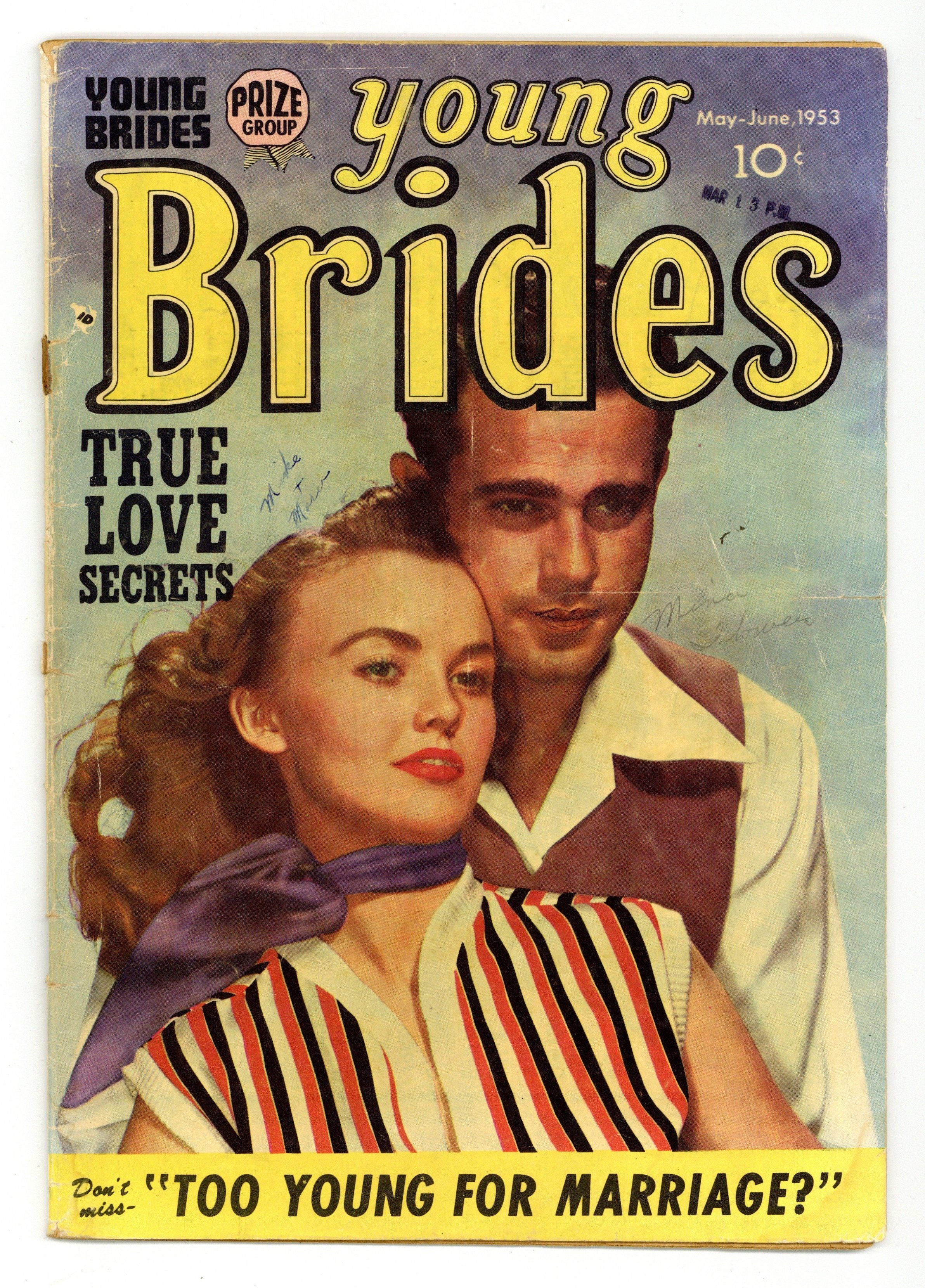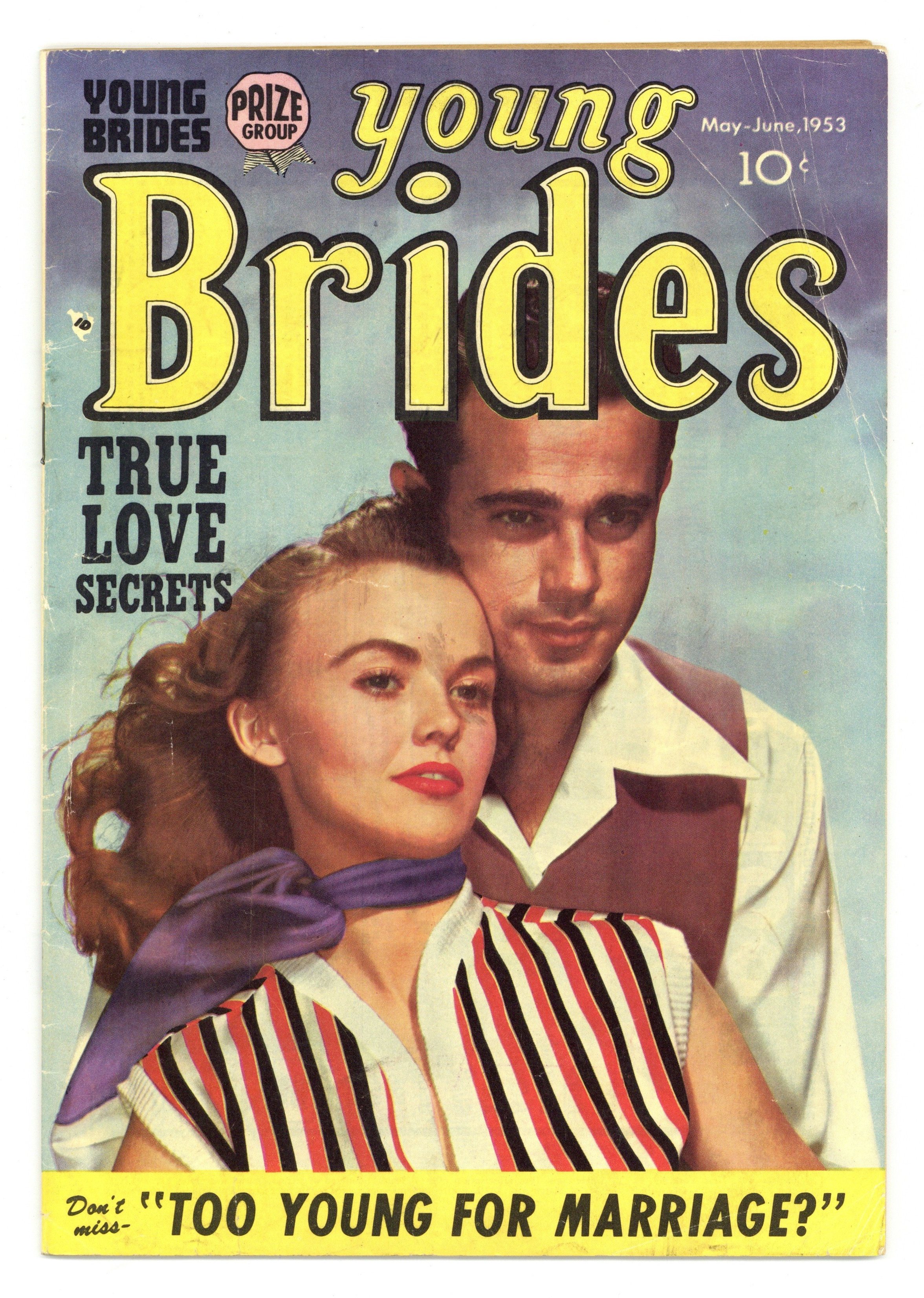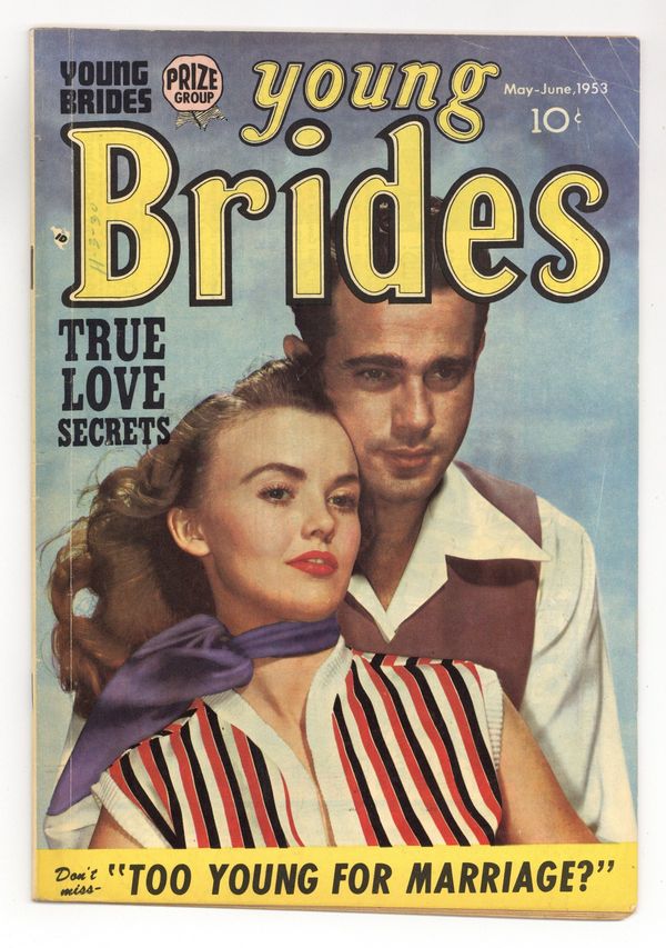 Volume 1, Issue 5. Whole number 5. Art by Natalie Krigstein, John Prentice, Bill Draut, and Mort Meskin. Another spinoff of the Young Romance comics series, created and produced by Captain America creators Joe Simon and Jack Kirby. Julie gets a job and leaves Frank home to take care of the baby, a radical concept in 1953. Ellie faces heartache when she learns she was adopted as a baby. Gary seeks Hildy's advice on girls, but doesn't love her until she's already married. Let's Change Places; Kiss and Keep Quiet; Stepchild; Too Young to Be Married; Button Up Your Overcoat; Don't Cry on My Shoulder. 36 pages, full color. Cover price $0.10.