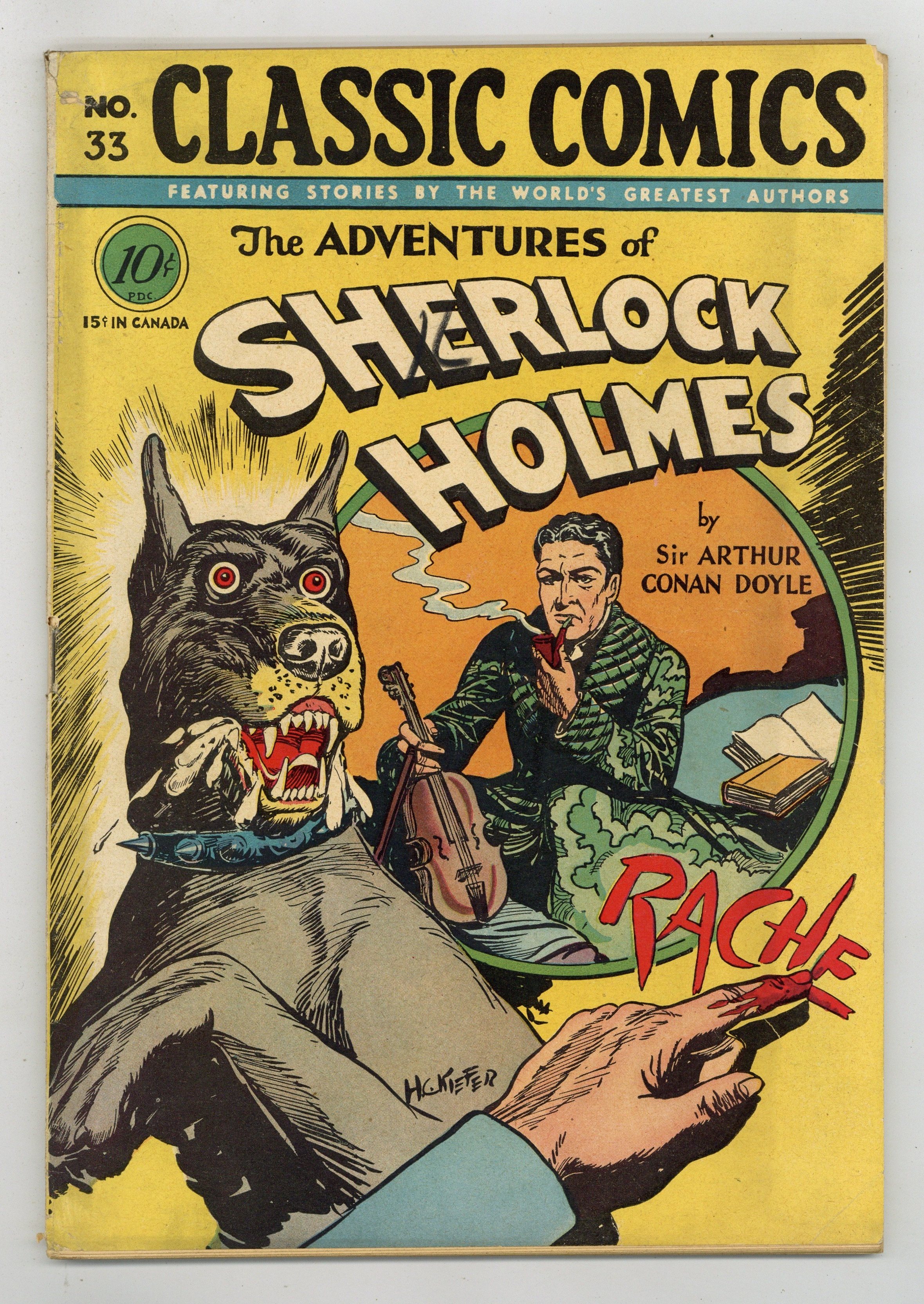 Adventures of Sherlock Holmes, 1st Printing, Classics Comics. Kiefer cover, contains Hound of the Baskervilles & A Study in Scarlet, 68 pgs. (HRN 33, 1/47). Cover price $0.10.