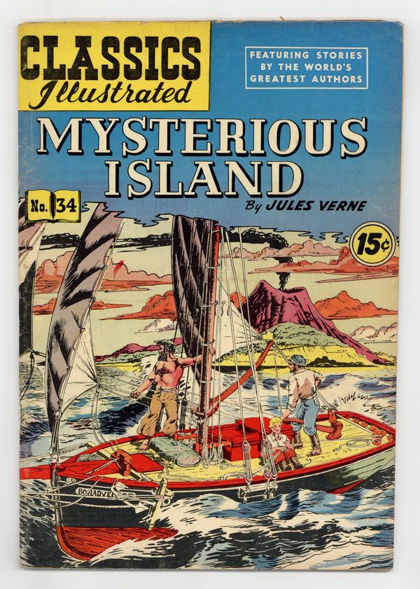 Mysterious Island, 7th Printing, Line Drawing Cover. Comic book adaptation of the classic Jules Verne story about a group of men marooned on an island. Story adapted by Manning L. Stokes and illustrated by Robert Hayward Webs and David Heames. Issue also has a text biography of Verne. (HRN 117, original 2/47 date). Cover price $0.15.
