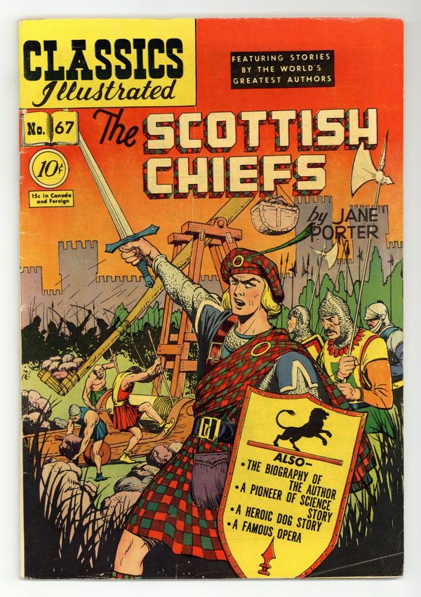 Published Jan 1950 by Classics Illustrated.$16.00The Scottish Chiefs, 1st Printing, Line Drawing Cover. (HRN 67, 1/50). Cover price $0.10.