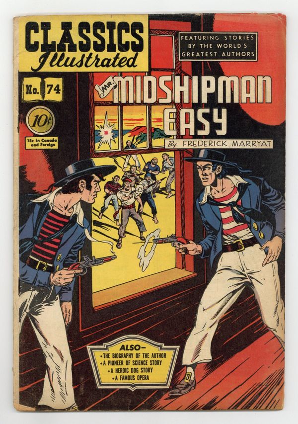 Published Aug 1950 by Classics Illustrated.$21.50Mr. Midshipman Easy, 1st (and only) Printing, Line Drawing Cover. (HRN 75, 8/50). Jack Easy is his name - midshipman and sailor of fortune. He takes everything that the toughest British seaman can dish out - and he always comes up for more. This is in the Royal Navy as it wars against the Spanish pirates of the 19th century. So ride the waves and reef the sails, and the guns with Mr. Midshipman Easy. Cover price $0.10.