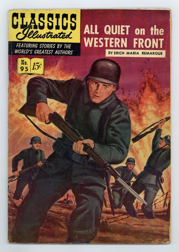 Published May 1952 by Classics Illustrated.$12.00All Quiet on the Western Front, 1st Printing, Painted Cover. (HRN 99, with 5/52 date). The time is World War I - the scene, the battlefield, the story, told by one who was in the midst of it. Here is the unglorious, the unexciting, the unglamorous side of war and death...here is the story of the soldiers who fight. Here is the soul-stirring drama of the frontlines. Cover price $0.15.