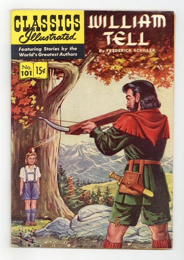 Published Nov 1952 by Classics Illustrated.$9.20William Tell, 1st Printing, Painted Cover. (HRN 101, with 11/52 date). The year 1307 finds the freedom-loving Swiss under the harsh rule of Austria. They are forced to bow before an arrogant governor's cap; they are humiliated and deprived of the personal freedoms. William Tell, by defying the tyrant governor's restrictive laws, through his unyielding belief in freedom, leads his people in rebellion against oppression. Cover price $0.15.