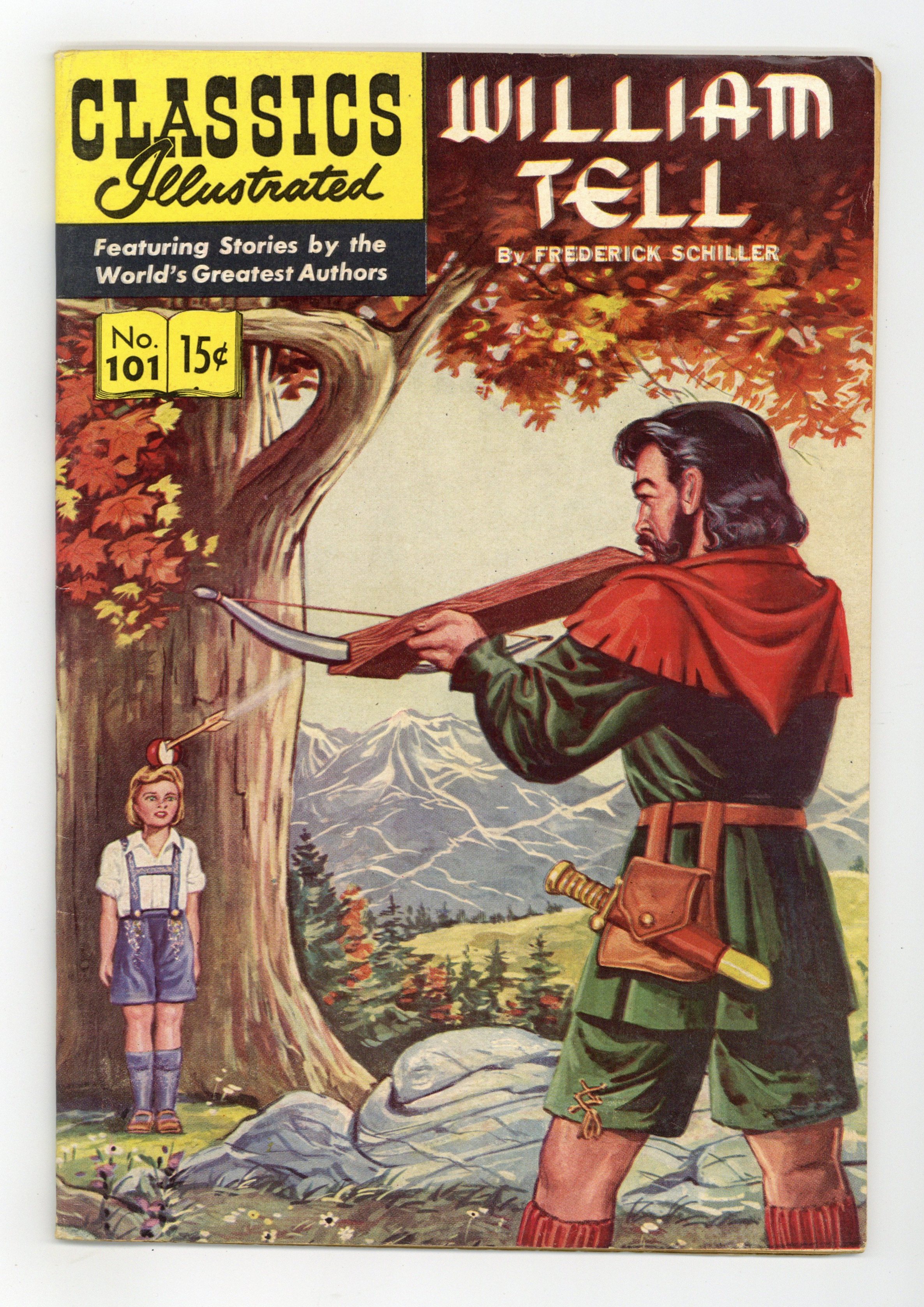 Published Nov 1952 by Classics Illustrated.$7.90William Tell, 1st Printing, Painted Cover. (HRN 101, with 11/52 date). The year 1307 finds the freedom-loving Swiss under the harsh rule of Austria. They are forced to bow before an arrogant governor's cap; they are humiliated and deprived of the personal freedoms. William Tell, by defying the tyrant governor's restrictive laws, through his unyielding belief in freedom, leads his people in rebellion against oppression. Cover price $0.15.