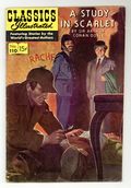 Published Aug 1953 by Classics Illustrated.$10.00A Study in Scarlet, 1st printing, Painted Cover. Sherlock Holmes stars in "A Study in Scarlet" and "The Adventure of the Speckled Band." Art by Seymour Moskowitz. Comic book adaptation of the classic detective story by Sir Arthur Conan Doyle that introduced Sherlock Holmes and Dr. John Watson to the world. Issue also has an comic book adaptation of another Sherlock Holmes story, "The Adventure of the Speckled Band" and a text biography on Doyle and text stories on "Our American Heritage" and "Stories from the World of Sports." (HRN 111, with 8/53 date). Cover price $0.15.