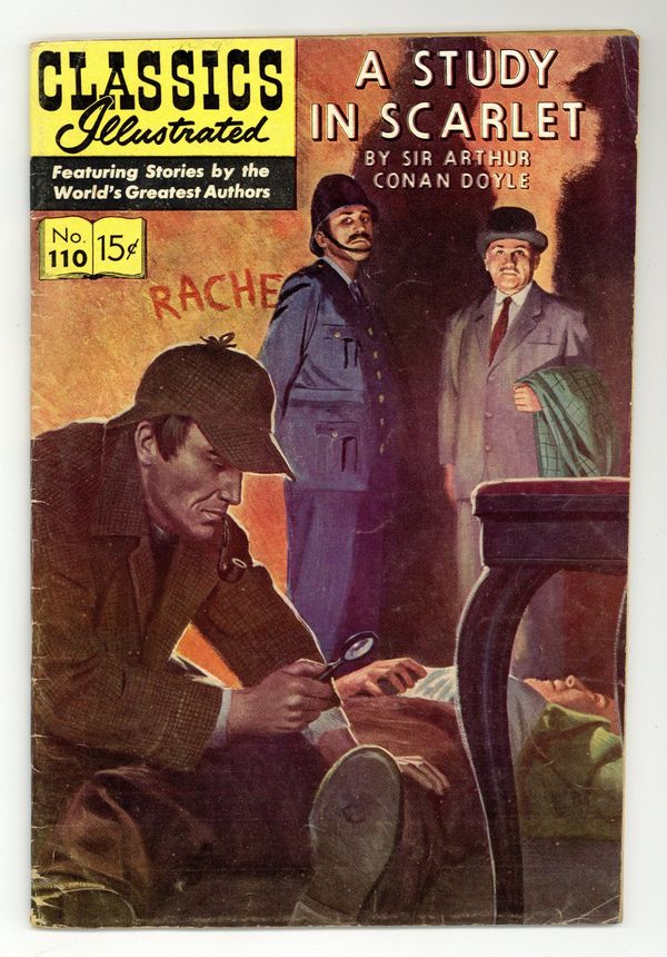 Published Aug 1953 by Classics Illustrated.$8.50A Study in Scarlet, 1st printing, Painted Cover. Sherlock Holmes stars in "A Study in Scarlet" and "The Adventure of the Speckled Band." Art by Seymour Moskowitz. Comic book adaptation of the classic detective story by Sir Arthur Conan Doyle that introduced Sherlock Holmes and Dr. John Watson to the world. Issue also has an comic book adaptation of another Sherlock Holmes story, "The Adventure of the Speckled Band" and a text biography on Doyle and text stories on "Our American Heritage" and "Stories from the World of Sports." (HRN 111, with 8/53 date). Cover price $0.15.