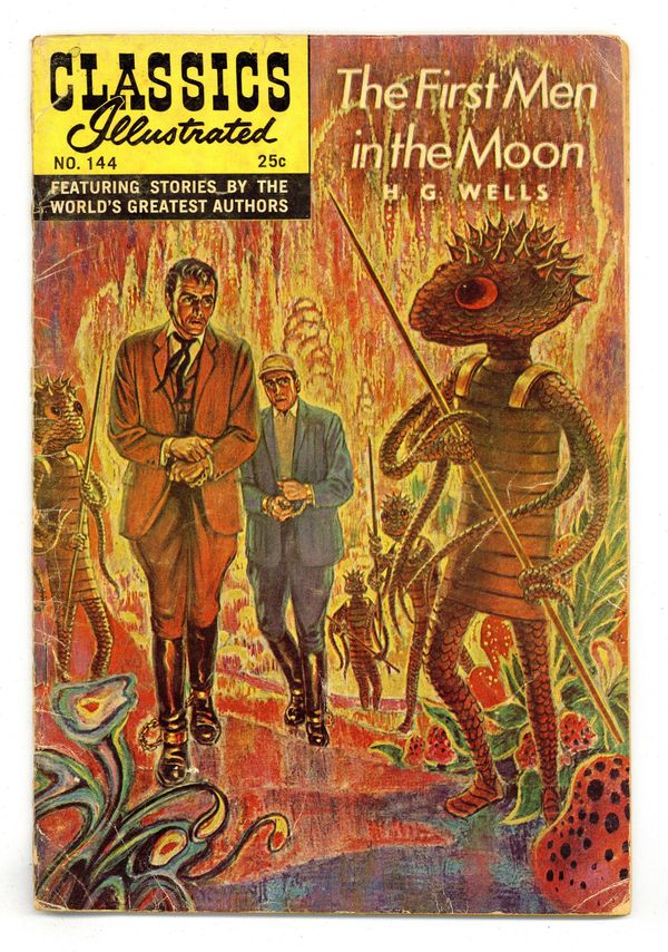 The First Men in the Moon, 1st Printing, Painted Cover on stiff paper. Art by George Woodbridge/Al Williamson/Angelo Torres. (HRN 166, with Fall 1968 date). We climbed out of our sphere and dropped upon the untrodden soil of the moon. It was unreal and fantastic. With one small leap we could travel thirty feet. But while we practiced our leaps, moon plants grew wildly around us, erasing our sphere from sight. We were stranded on the moon, at the mercy of its inhabitants - the Selenites. Cover price $0.25.
