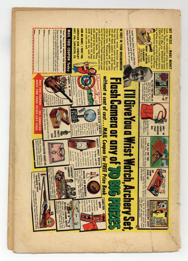 Cover by Carl Burgos. "The Man Who Didn't Belong!", art by Paul Reinman; An ugly sailor is washed overboard with a casket containing a female android that scientists were wanting to do experiments with and the two of them wind up on an island. "The Rookie!" text story. "It Waits in Space!", script by Paul S. Newman, art by Robert Q. Sale; A spaceman is abducted by aliens who give him a computer test in order to determine if he harbors hostile intent. "For the Birds," art by Mort Lawrence; A henpecked employee that is forced to eat bird seed as a food tester sprouts wings. "Pleasant Dreams, Sir!", art by Hy Rosen; A man dozes off in a bath house and when he wakes he sees a strange creature. "The Dungeon," art by Tony DiPreta; A man marries an ugly woman for her castle and then locks her in the dungeon to starve to death. 36 pgs., full color. $0.10. Cover price $0.10.
