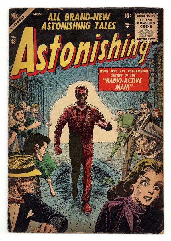 Cover art by Carl Burgos. The Radioactive Man!, art by John Romita; A man present at an atom bomb test is thrust back in time twenty-six years and rendered invisible. The Test!, art by Manny Stallman; A man takes a used car out on a test drive that takes him to Mars. Will O' The Wisp!, art by Bob Powell; Sailors see a ship that leads them out of dangerous sailing conditions until they follow her back to port and are told that the old vessel has not sailed in forty years. The Rival, art by Robert Q. Sale; A man is being sexually harassed in the workplace by his robot manager. Man Alone!, art by Fred Kida. 36 pgs. $0.10. Cover price $0.10.