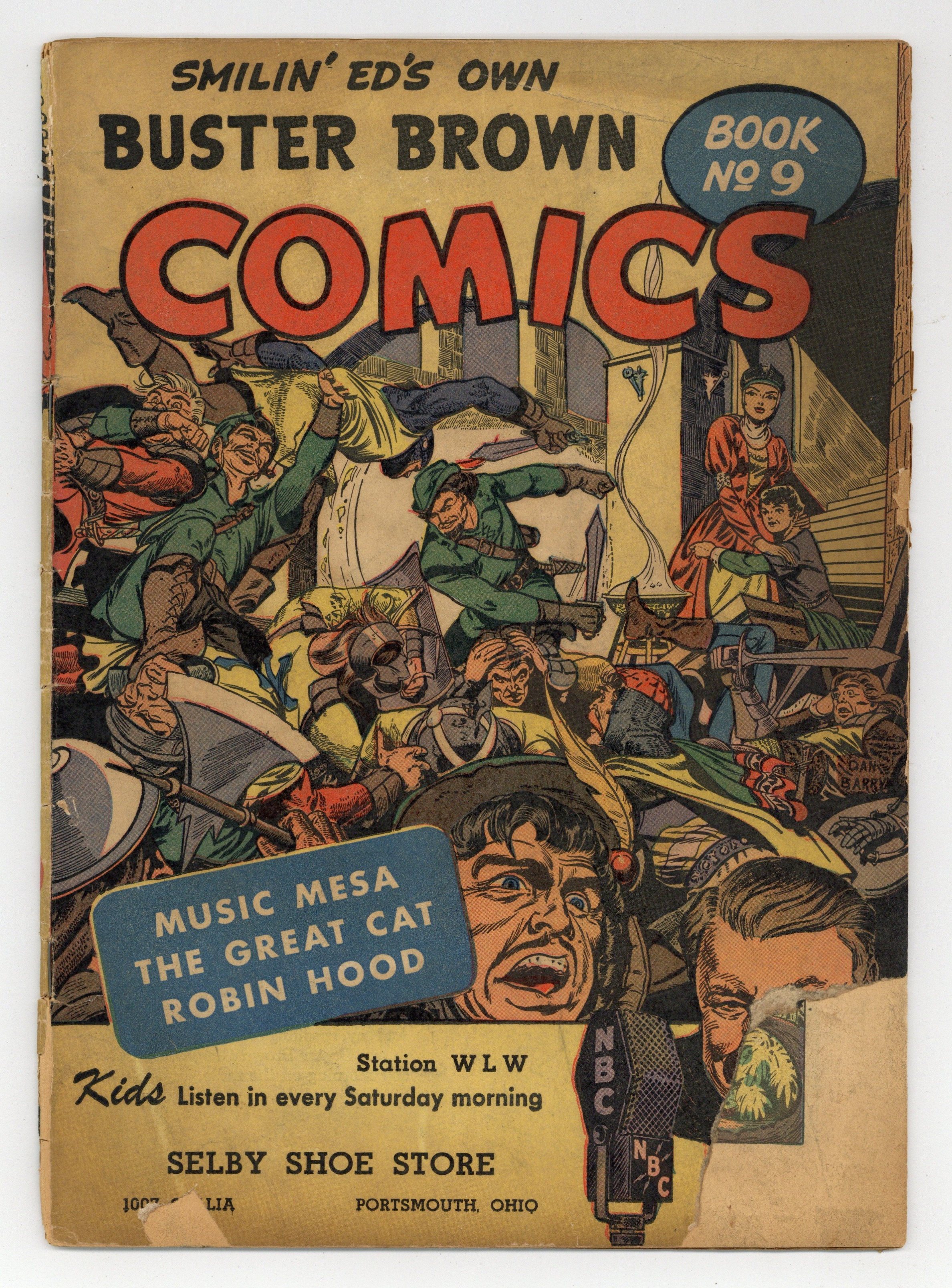 Stories by Hobart Donovan and Ed McConnell. Art by Dan Barry, John Belfi and Fred Kida. Cover by Dan Barry. A classic giveaway comic from the Brown shoe company, featuring adventure stories and humorous songs by radio personality Smilin Ed. Robin Hood encounters a young prince; A bearded stranger defends a Western town from outlaws; plus the Smilin Ed songs The Clapping Song and They Never Have To Go To School. Robin Hood and the Princeling; The Clapping Song; Mystery of Music Mesa; They Never Have To Go To School; The Power of the Great Cat. 32 pages, Full Color.