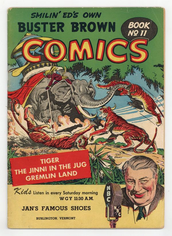 Stories by Hobart Donovan. Art by Dan Barry, Walt Scott, Emil Gershwin, John Giunta and Sy Barry. Cover by Dan Barry. A classic giveaway comic from the Brown shoe company, featuring adventure stories and comical hijinks from radio personality Smilin Ed and the Buster Brown Gang of talking animals. Smilin Ed visits Froggy Gremlins homeland; An Indian boy named Ghanga and his trained elephant fend off a tiger attack; Brothers find a genie and try to rescue a princess from a wizards curse in ancient Persia. Smilin' Ed McConnell and His Gang in Gremlin Land; Tiger; The Jinni in the Jug. 32 pages, Full Color.
