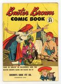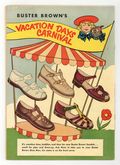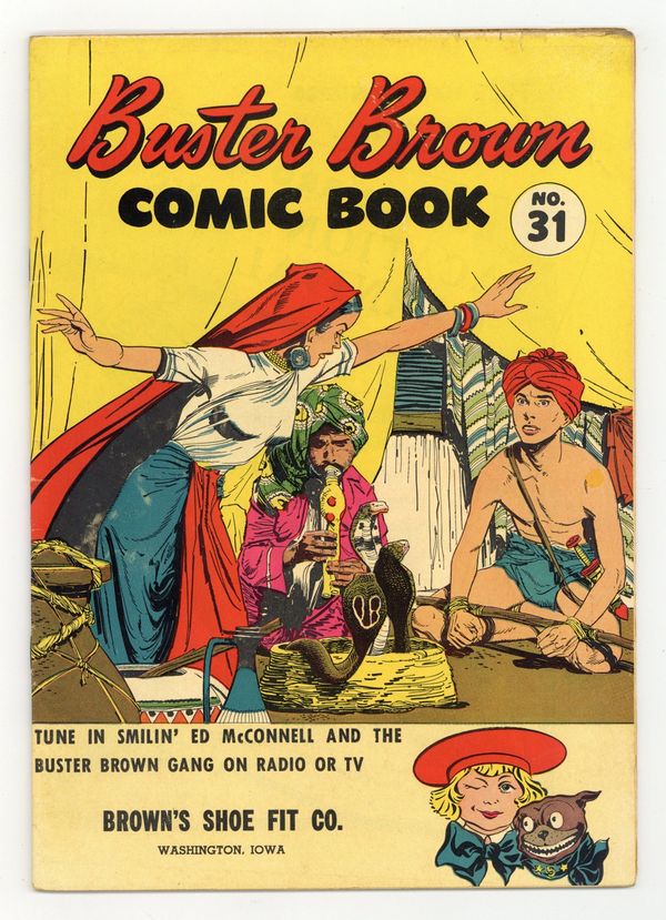 Stories by Hobart Donovan. Art by Ray Willner and Reed Crandall. Cover by Ray Willner. A classic giveaway comic from the Brown shoe company, featuring adventure stories and comical hijinks from radio personality Smilin Ed and the Buster Brown Gang of talking animals. Smilin Ed and the Buster Brown Gang visit a farm and chaos ensues; Gunga the elephant boy is hypnotized as part of a plot to steal the Maharajahs ruby; The Interstellar Police Bruce and Terry set out to rescue the scientist who invented the space magnet. The Blood Ruby; Smilin Ed and his Gang Have Fun on the Farm; Space Magnet. 32 pages, Full Color.