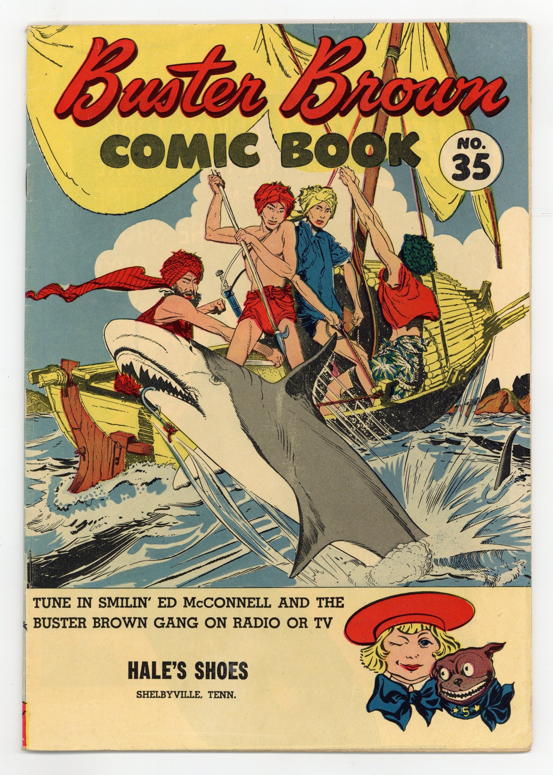 Stories by Hobart Donovan. Art by Ray Willner and Reed Crandall. Cover by Ray Willner. A classic giveaway comic from the Brown shoe company, featuring adventure stories and comical hijinks from radio personality Smilin Ed and the Buster Brown Gang of talking animals. Smilin Ed and the Buster Brown Gang visit the Grand Canyon and chaos ensues; A Chinese youth has only his wits to defend his family farm from a warlords wrath; Gunga the elephant boy investigates tiger shark attacks on a coastal town. Gunga; Smilin Ed and His Gang Take a Trip to the West; Seeds of Gold. 32 pages, Full Color.