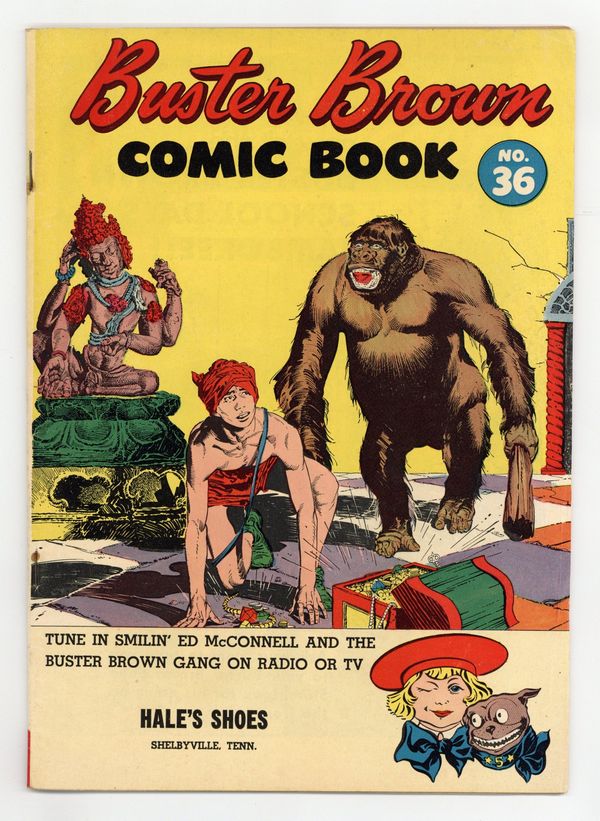 Stories by Hobart Donovan. Art by Ray Willner and Reed Crandall. Cover by Ray Willner. A classic giveaway comic from the Brown shoe company, featuring adventure stories and comical hijinks from radio personality Smilin Ed and the Buster Brown Gang of talking animals. Smilin Ed and the Buster Brown Gang try to spruce up the schoolyard and chaos ensues; Strong Bow and Little Fox face danger while on the hunt for a white puma; Gunga the elephant boy investigates reports of a malevolent monkey god. Menace in the Seventh Pagoda; Smilin Ed and His Gang Fix Up the Schoolyard; Puma Peril. 32 pages, Full Color.