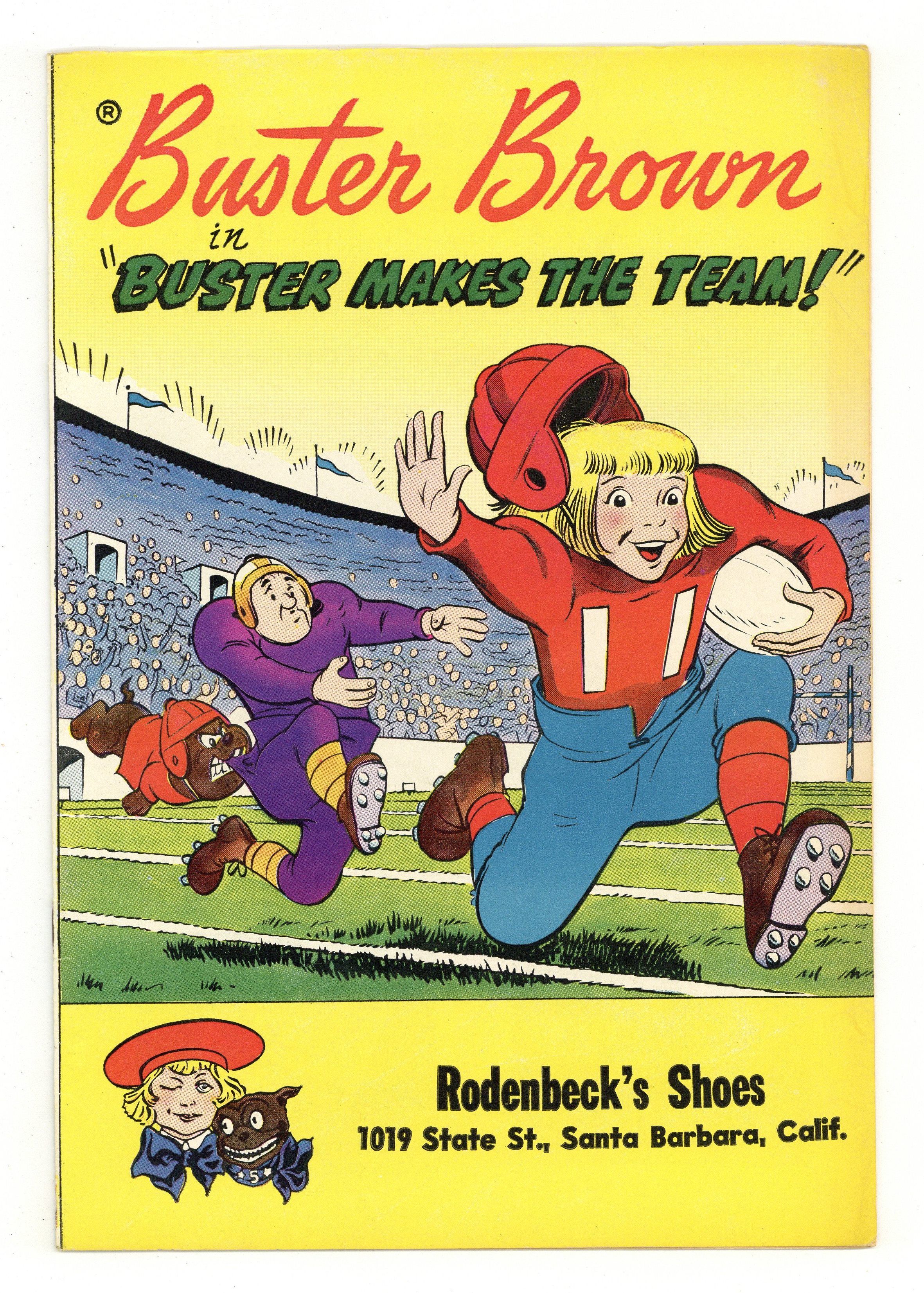 Published 1959 by Brown Shoe.$2.65Edited by Richard Hughes. Art and cover by Pete Costanza. A classic giveaway comic from the Brown shoe company, featuring one of the very earliest American comics characters, Buster Brown. Trying to earn money to keep his school open, Buster first tries to start his own wrestling league, then joins the football team. Produced by the Custom Comics arm of legendary independent publisher American Comics Group (ACG). 20 pages, Full Color.