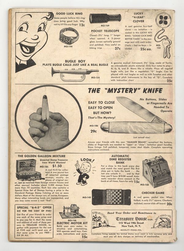 Edited by David Adams. Cover by Bob Davis. Stories by Bob Davis, Malcolm Kildale, Ray Gill, Paul Gustavson, Bill O'Connor, Ben Flinton, Leonard Sansone, Jack A. Warren, Harold DeLay, Henry Kiefer, Alan Mandel, Jack A. Warren, and John Daly. Dick Cole battles Simba Karno, who reforms after this story. Sergeant Spook encounters the ghost of Cyclopes and Hercules. In the Painted Desert starring The Twister. Edison Bell and Jerry win a round trip to the South Seas. The White Rider and Super Horse hurry through the sheer walls of Canyon Diablo. Blue Bolt the American origin retold. Sub-Zero story featuring Freezums intro and origin. Paper-Tube Periscope! activity page. 68 pages, $0.10. Cover price $0.10.