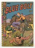 Published Jul 1946 by Funnies, Inc..$24.00Cover by Tom Gill. Stories and art by Joe Donohoe, Ray Gill, Jim Wilcox, Don Rico, Milt Hammer, Jack Warren, and Tom Gill. Sometimes listed as Blue Bolt #68. Blue Bolt has adventures while flying for Glimpses, a photography magazine. A court tries to prove Jerry is insane, because only he can see Sergeant Spook. Blue Bolt and Snap intervene when rumors of a hidden treasure map cause unrest in the Pacific Northwest. Also featuring a vintage Shelby bicycle ad in comics form, featuring the Ringling Circus and the Flying Wallendas. Dick Cole; Sergeant Spook; Krisko & Jasper; Blue Bolt: Mystery of the Vanishing Totem Poles; Fearless Fellers; Death Fall; Edison Bell; Bobby Shelby at the Ringling Circus; Sniffy; Toy Chariot; Bluebolts & Nuts. 48 pages, Full Color. Cover price $0.10.