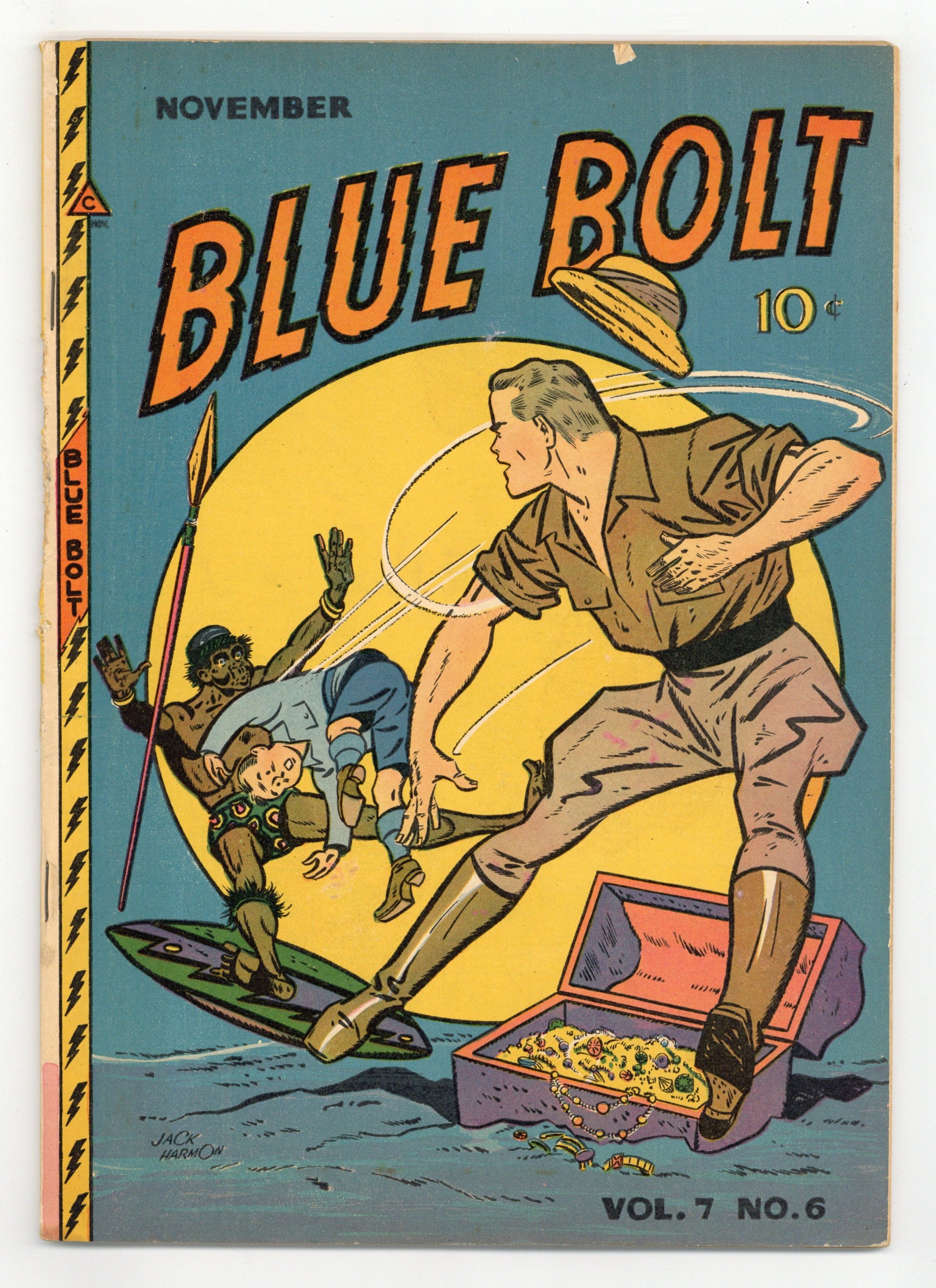 Cover by Wayne Boring (credited as Jack Harmon). Stories and art by Joe Donohoe, Ray Gill, Jim Wilcox, Don Rico, Milt Hammer, Jack Warren, Henry Kiefer, E. J. Reeves, Tex Blaisdell, and Wayne Boring (credited as Jack Harmon). Sometimes listed as Blue Bolt #72. Blue Bolt has adventures while flying for Glimpses, a photography magazine. Sergeant Spook helps when Jerry and his friend are blamed for a fatal accident. Blue Bolt finds trouble in the South American jungle, in a story (and cover) by Superman artist Wayne Boring (credited as Jack Harmon). A boating excursion turns dangerous for Edison Bell and Jerry when a storm catches them on the open sea. Edison Bell tells young readers how to create a midget sailboat. Also featuring vintage ads in comics form from "Pepsi" the Pepsi-Cola Cop and "U. S." Royal and His Jet-Propelled Bike. Dick Cole; Blue Bolt; Sergeant Spook; A Watch for Terry; Edison Bell; Edison Bells Midget Sailboat; Bluebolts & Nuts; Fearless Fellers; Krisko & Jasper. 48 pages, Full Color. Cover price $0.10.