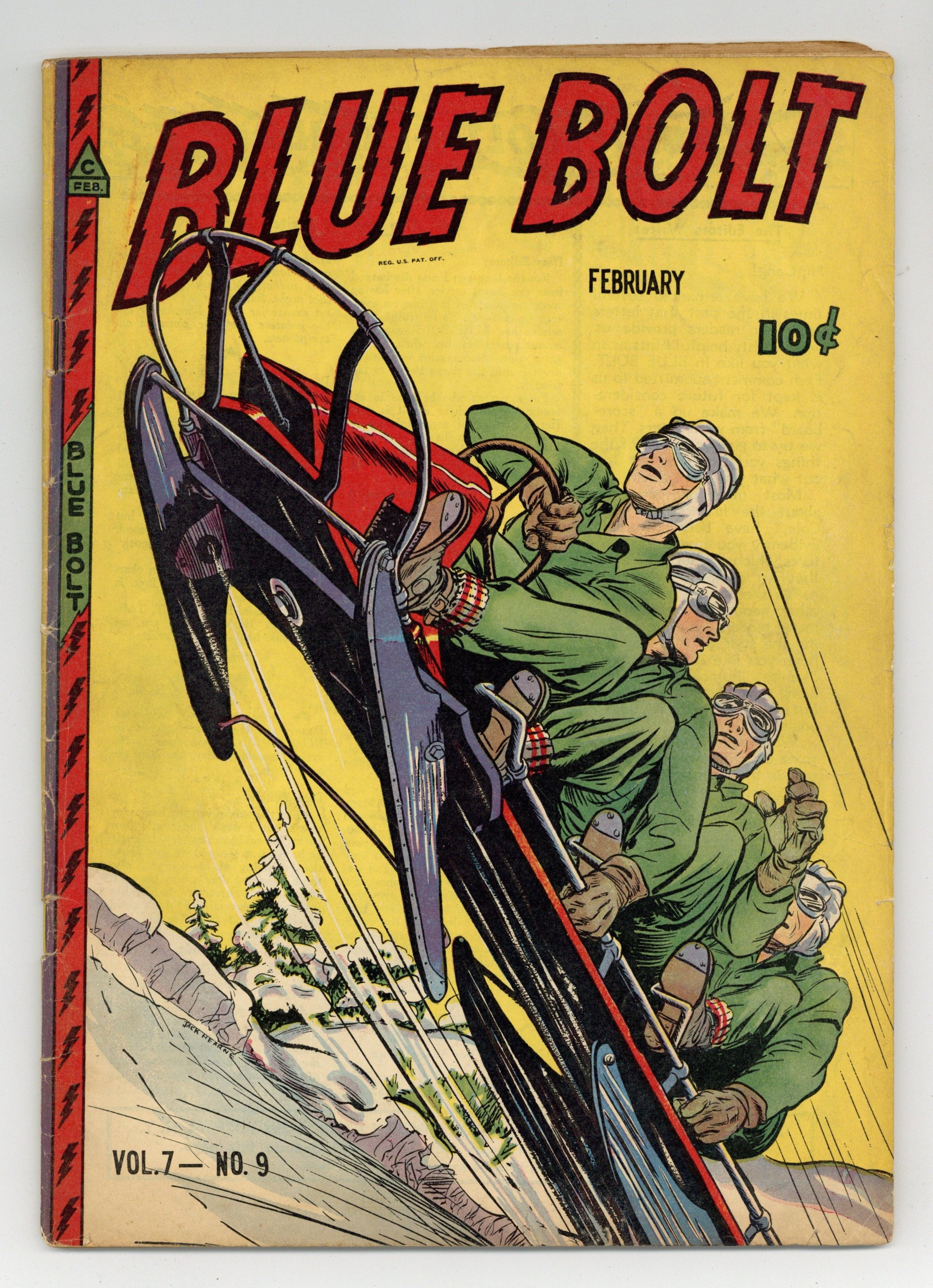 Cover by Jack Hearne. Stories and art by Joe Donohoe, Ray Gill, Jim Wilcox, Tex Blaisdell, Robert Pious, Art Helfant, Milt Hammer, Jack Warren, Henry Kiefer, and Wayne Boring (credited as Jack Harmon). Sometimes listed as Blue Bolt #75. Blue Bolt has adventures while flying for Glimpses, a photography magazine. Visiting Rio during Carnival, Blue Bolt intercedes in a riot, in a story by Superman artist Wayne Boring (credited as Jack Harmon). Cap Hawkins tells the true story of football great Red Grange, "The Galloping Ghost," in a story with some nice sports art by Robert Pious. Edison Bell escalates a snowball-war with neighboring kids by building a snow catapult. Edison Bell tells young readers how to create a snow catapult. Dick Cole; Bluebolts & Nuts; Rick Richards; Cold Courage; Edison Bell; You Can Build This Snow Catapult; Cap Hawkins True Tales; The Lesson; Blue Bolt; Krisko & Jasper; Boitram, The Boiglar: Road To Ruin. 48 pages, Full Color. Cover price $0.10.