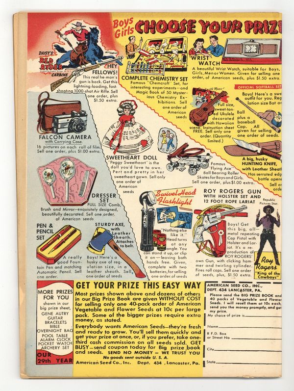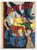 Published Mar 1947 by Funnies, Inc..$30.00Cover by Wayne Boring (credited as Jack Harmon). Stories and art by Joe Donohoe, Ray Gill, Jim Wilcox, Tex Blaisdell, Jack Hearne, E. J. Reeves, Don Rico, Art Helfant, Milt Hammer, Jack Warren, Henry Kiefer, and Wayne Boring (credited as Jack Harmon). Sometimes listed as Blue Bolt #76. Blue Bolt has adventures while flying for Glimpses, a photography magazine. In the South American Andes, Blue Bolt battles a human vulture, in a story (and cover) by Superman artist Wayne Boring (credited as Jack Harmon). Sergeant Spook and Jerry investigate when a priceless Stradivarius violin is switched for another. Edison Bell builds a new sled for a race against neighbor kids. Edison Bell tells young readers how to create an airflow springsled. Dick Cole; Bluebolts & Nuts; Rick Richards; Heathcliff the Hobo; Gimpy; Edison Bell; Airflow Springsled; Blue Bolt; Krisko & Jasper; Sergeant Spook; Two-Ton O'Toole. 48 pages, Full Color. Cover price $0.10.