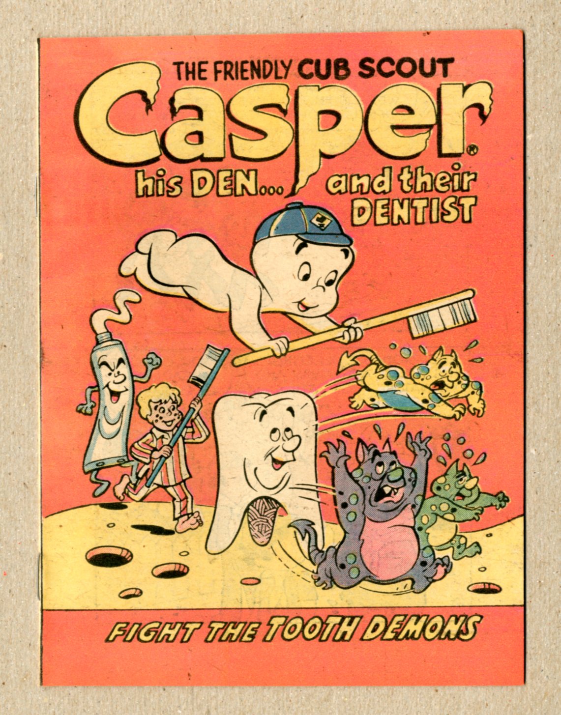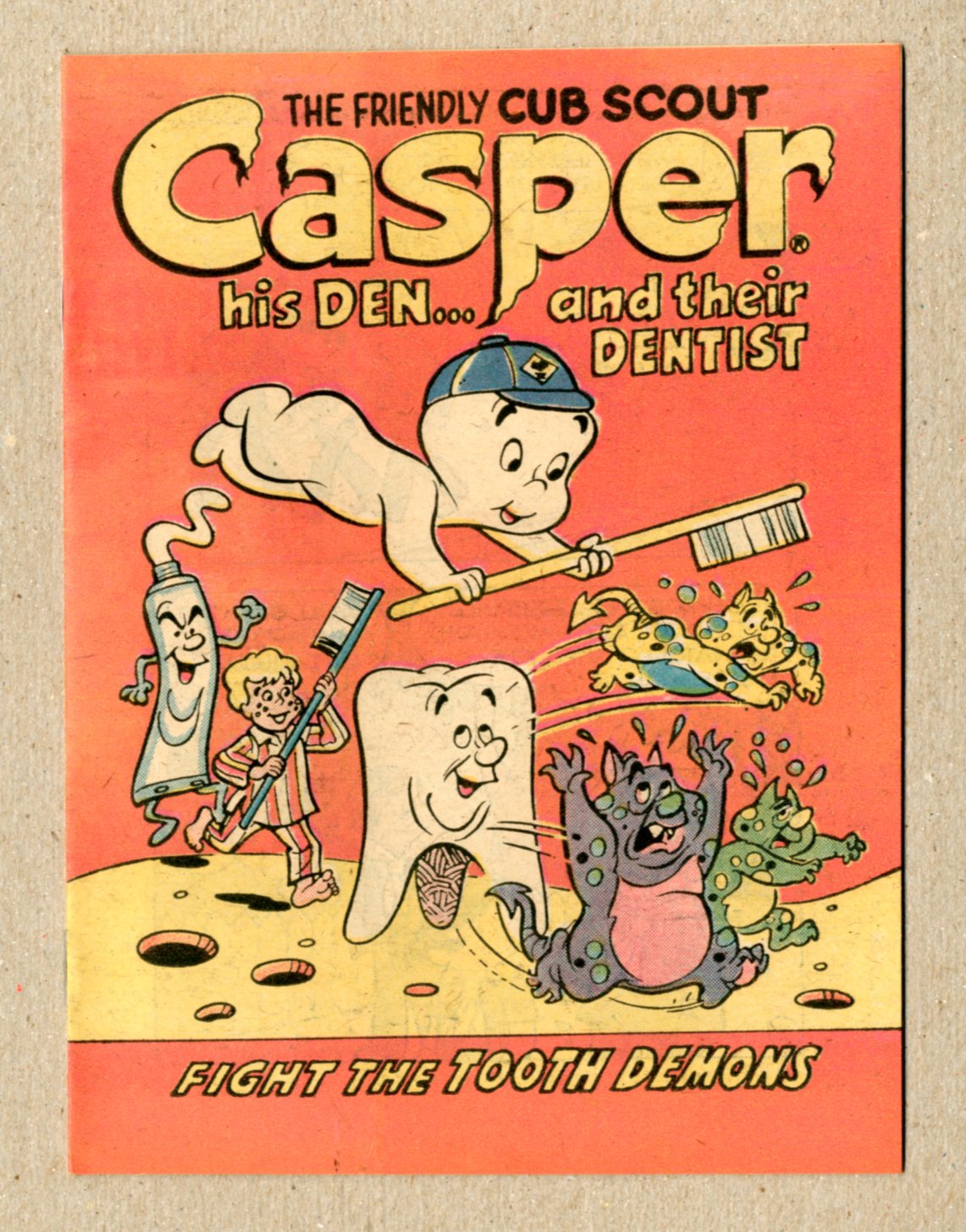 Casper the Friendly Ghost, His Den, & Their Dentist Fight the Tooth Demons is a promotional comic/dental health PSA published by Harvey Comics for the American Dental Association, promoting dental health for Cub Scouts and other young readers. When the Tooth Demons arrive to threaten enamel and gum alike, Casper and his Cub Scout troop (or "den") fight back with proper dental hygiene. 5-in. x 7-in. 16 pages, Full Color.