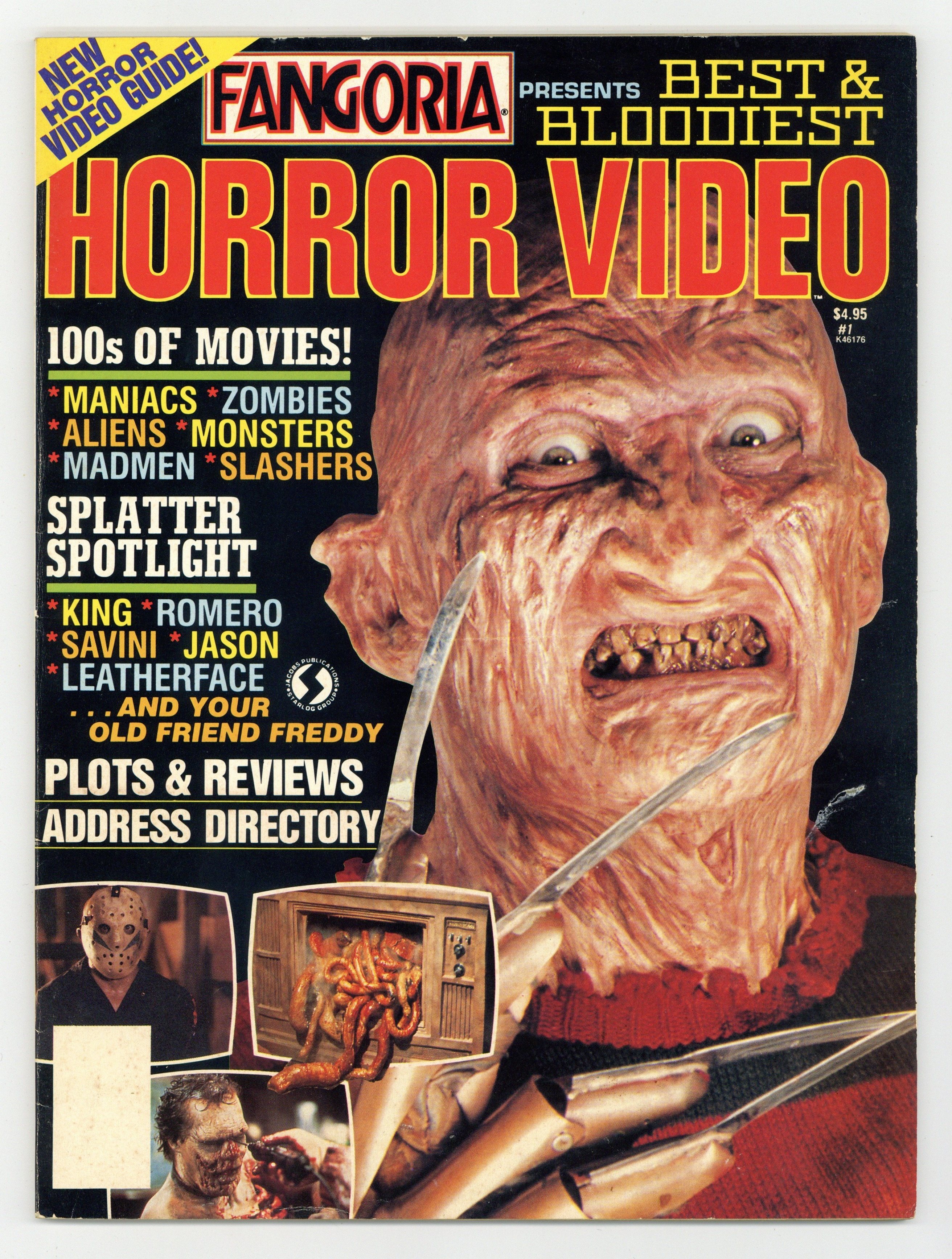 New horror video guide! 100s of movies! Maniacs, zombies, aliens, monsters, madmen, slashers. Splatter Spotlight - Stephen King, George Romero, Tom Savini, Jason, Leatherface, Freddy. Plus: Plots & Reviews, Address Directory. Freddy from Nightmare on Elm Street cover. Cover price $4.95.