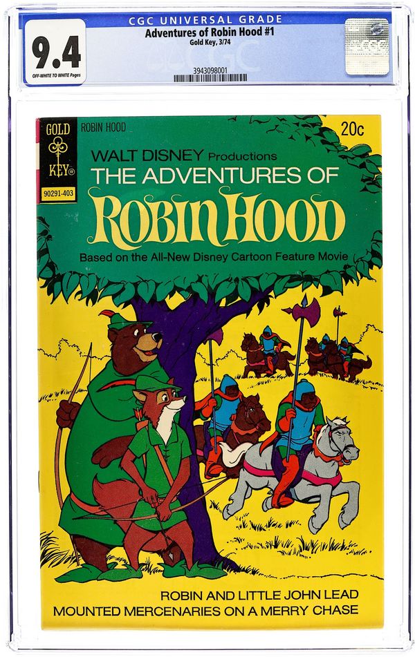 Based on the Disney Cartoon Feature Movie. Robin and Little John lead mounted mercenaries on a merry chase. The 25 page Robin Hood reprint story "The Mystery of Sherwood Forest" is drawn by Pete Alvarado. Cover price $0.20.