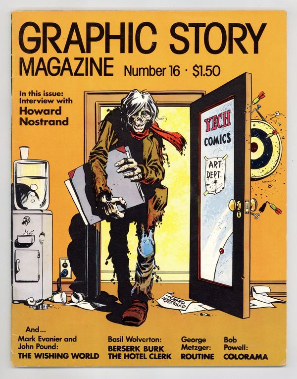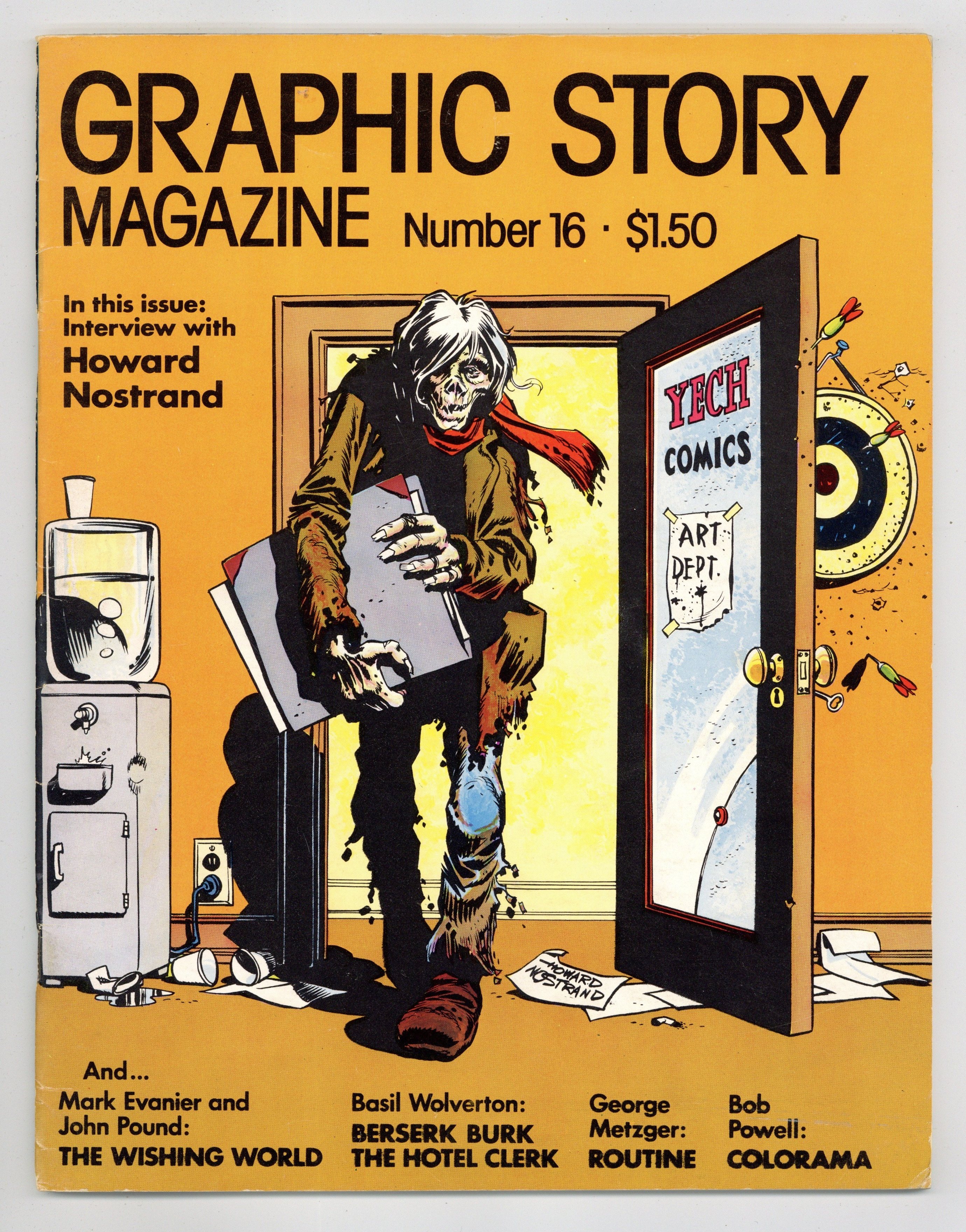 Issue #16 of Graphic Story Magazine (formerly Fantasy Illustrated) includes the following: The Wishing World strip by Mark Evanier and John Pound; Berserk Burk strip; letters by SF writer Howard Waldrop and comic book writer Mark Evanier; Nostrand by Nostrand column by Howard Nostrand; an interview with Nostrand; Colorama strip by Bob Powell; and Routine strip by George Metzger. Summer, 1974. 48 pgs. Cover price $1.50.