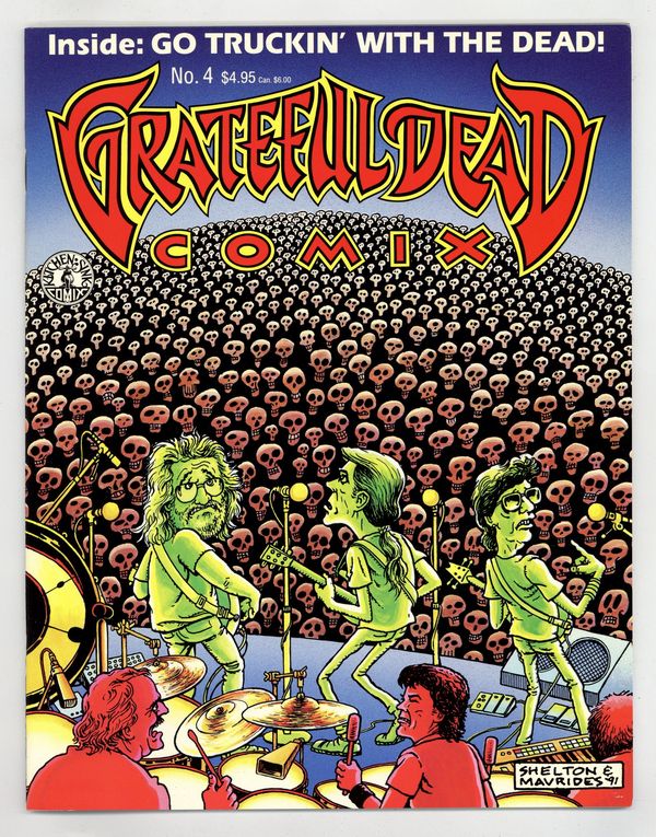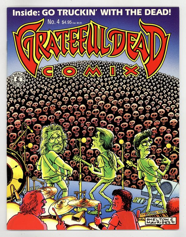 Published 1992 by Kitchen Sink.$14.50Comics adaptations of Grateful Dead songs: Truckin' by Nina Paley, Mexicali Blues by Pat Redding, Jack Straw by Tim Truman, and St. Stephen by Mary Fleener. Cover by Gilbert Shelton and Paul Mavrides of the Freak Brothers. Also the only cover to show the whole Grateful Dead band. Cover price $4.95.
