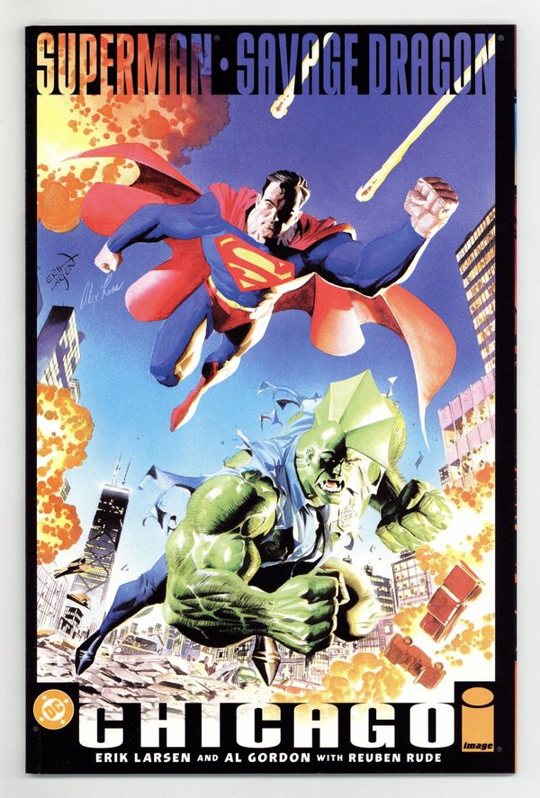 WRITTEN BY ERIK LARSEN; ART BY LARSEN AND AL GORDON; COVER BY LARSEN AND PAINTED BY ALEX ROSS The pulse-pounding prequel to SUPERMAN & SAVAGE DRAGON: METROPOLIS! A heaping helping of Metropolis heavies have hightailed it to the Windy City to join forces with the Vicious Circle. Superman must form an uneasy alliance with the Savage Dragon to rid two cities of two sets of super- villains! For more information, see the feature article. Copublished with Image Comics. Prestige Format. FC, 48 PG $5.95 Cover price $5.95.