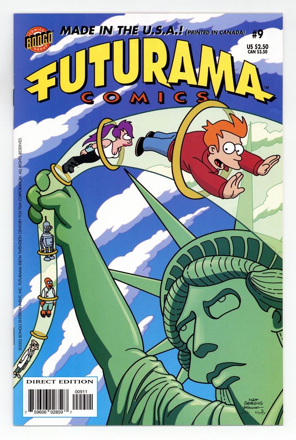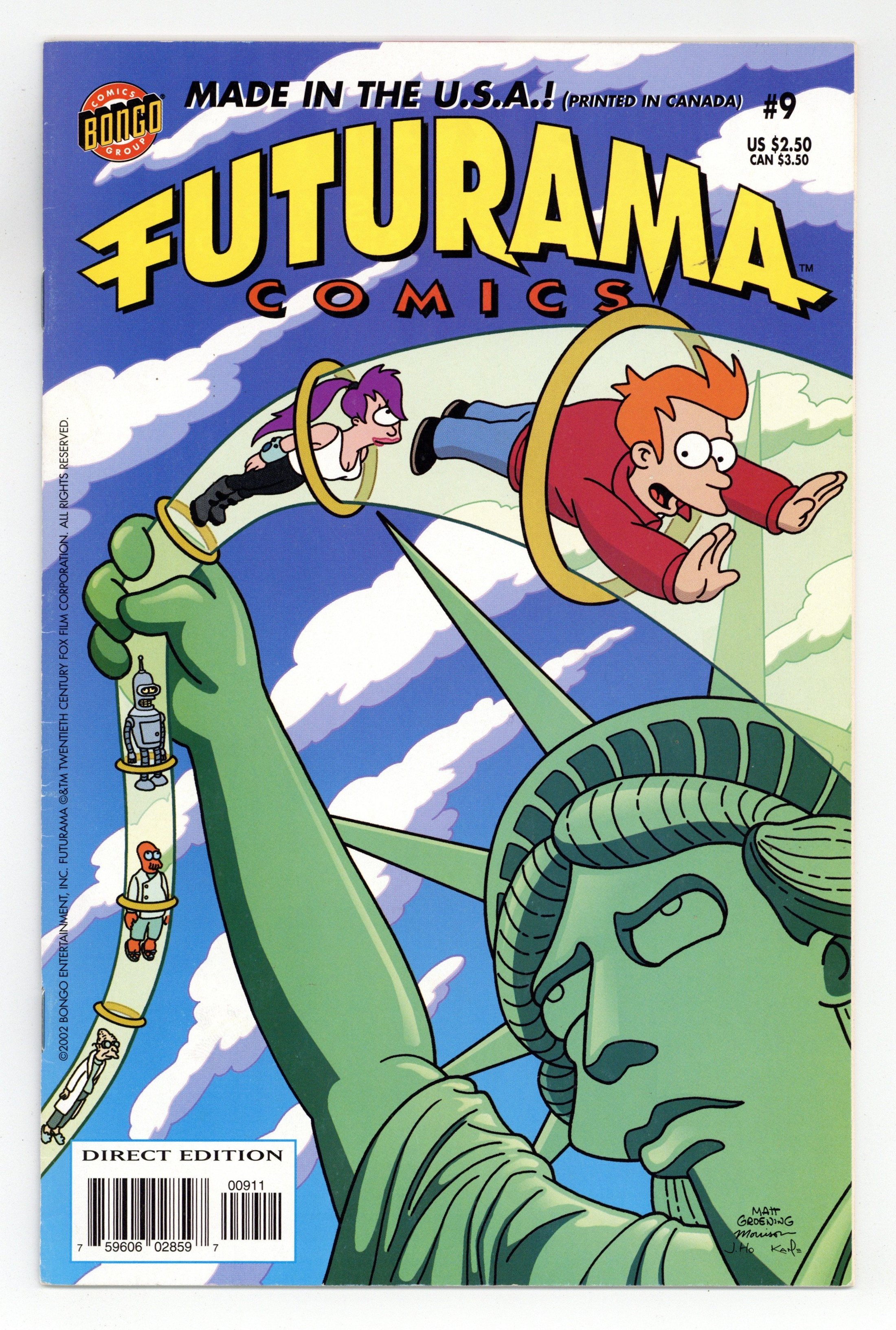 by Rogers, King, & Morrison It seems like "Great Nephew Day" creeps up on you all of a sudden, just like "Red-Headed Stepchild Day." So Fry goes in search of the perfect gift for Professor Farnsworth. Little does he know that his gift will lead to a scientifically unexplainable phenomenon that will make them both swap bodies! The whole thing turns into a really "Freaky Fry Day," and just when you were finally putting away the decorations from "Kumquat Appreciation Day!" FC, 32pg $2.50 Cover price $2.50.