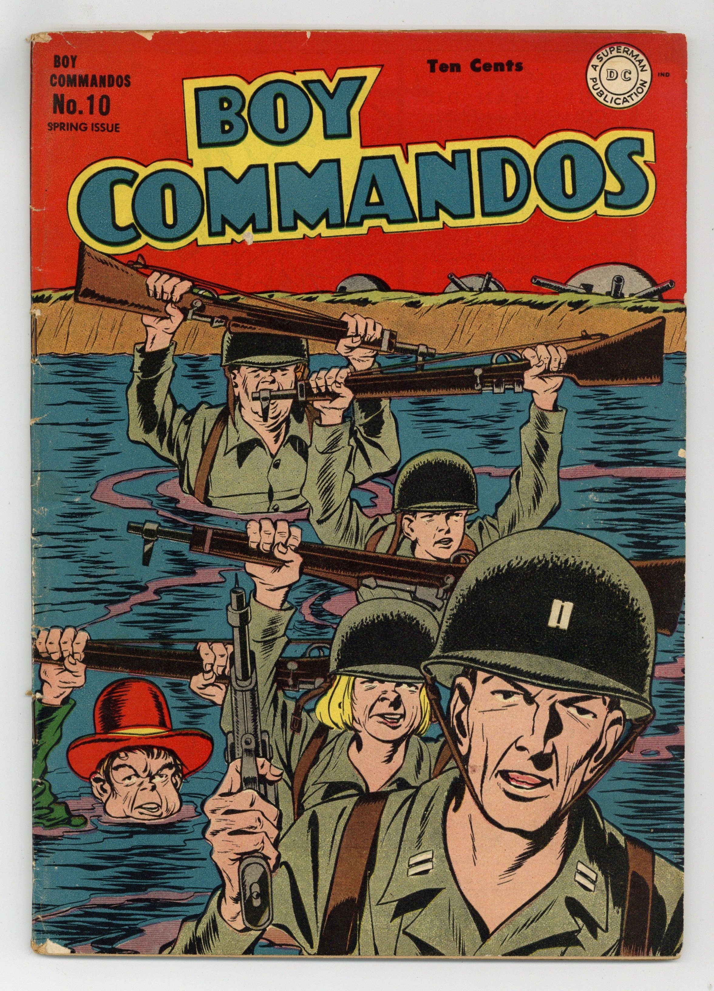 World War II cover. Cover pencils by Louis Cazeneuve. Thunder In China, pencils by Louis Cazeneuve [ghosting for Jack Kirby]; the boys visit China far from the front to see how the country prepares for war; they visit one of the "cooperative" factories. Brooklyn Goes to Town, pencils by Louis Cazeneuve [ghosting for Jack Kirby]; the boys get tricked into spreading counterfeit money throughout London. Drums of Doom text story by Murray Boltinoff [as Blair Bolton]. Camouflage Unit No. 10 starring Jitters Jeep, script and art by Jack Farr. Trouble Down Mexico Way, pencils by Louis Cazeneuve [ghosting for Jack Kirby]; the Boys battle fifth columnists down in Mexico. Kraut Clouting Outing starring Drafty and Tim. 52 Pages, Full Color. Cover price $0.10.